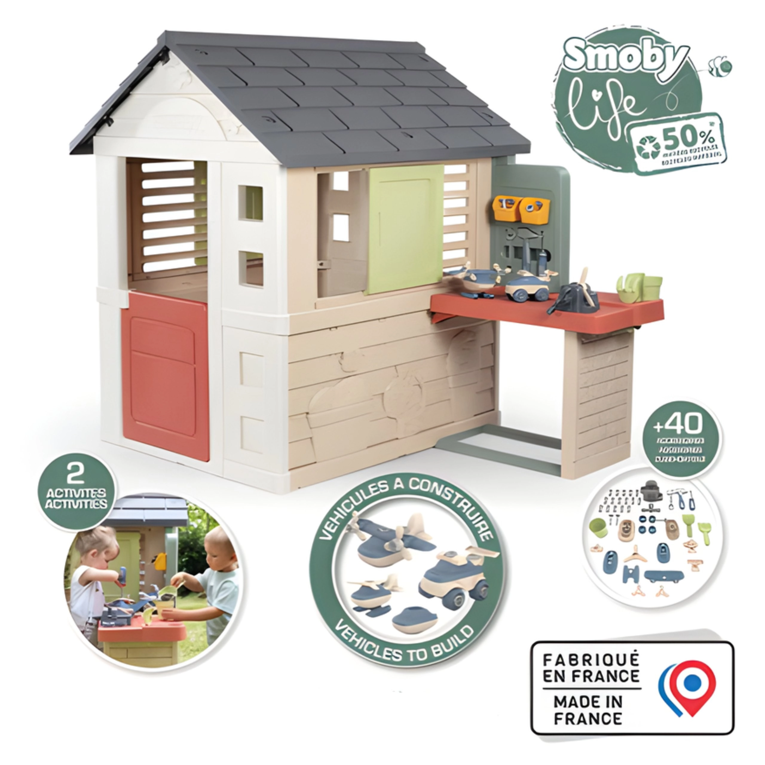 Objevte kouzlo venkovní hry s dětským domečkem SMOBY s připojenou dílnou a 39 doplňky. Robustní, UV stabilní plast odolá počasí, zatímco prostorné provedení s pracovní plochou, okny s lamelami a polovičními dveřmi podporuje kreativitu, jemnou motoriku a hraní rolí na zahradě i terase.