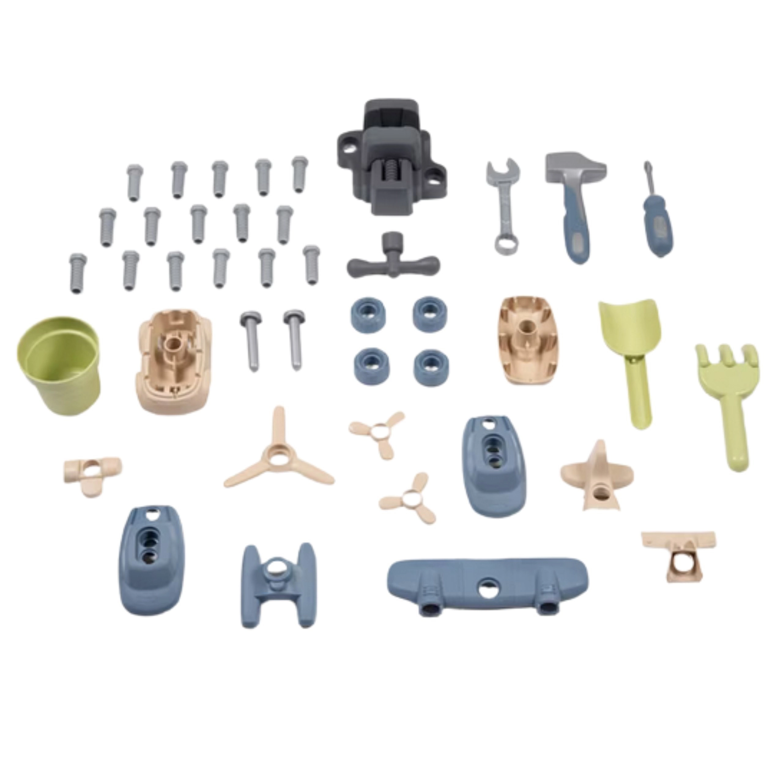 Součástí je bohatá sada nářadí a spojovacích dílů (kladívko, šroubovák, klíče, šrouby, matice a další), které rozvíjejí koordinaci ruka–oko, logické myšlení a zručnost. Dvě okna s nastavitelnými lamelami a částečně otevíratelné dveře přinášejí skvělou ventilaci a realistický zážitek z hry.
