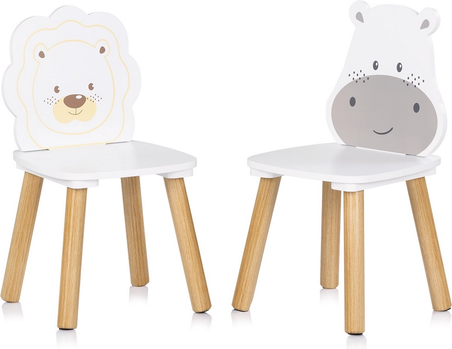 Dvě židle s roztomilými zvířecími opěrkami – hrošík a lvíček – podněcují fantazii a dělají z učení i hraní zábavu.