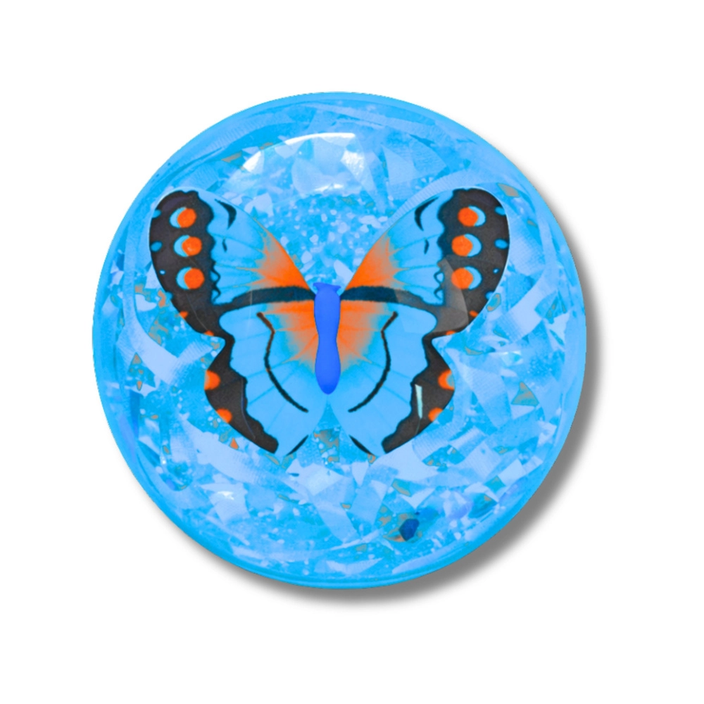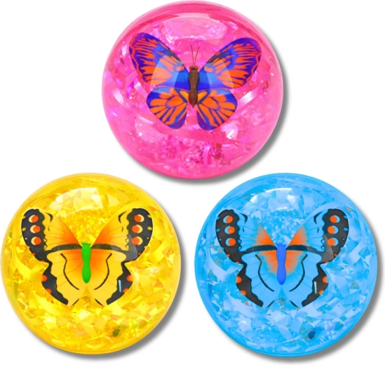 Zábavný svítící skákací míček s průhledným designem, třpytivým konfety a dekorativním motýlem uvnitř. Po dopadu bliká více barvami, skvěle se odráží díky elastickému kaučuku a láká děti k aktivní hře doma i venku.