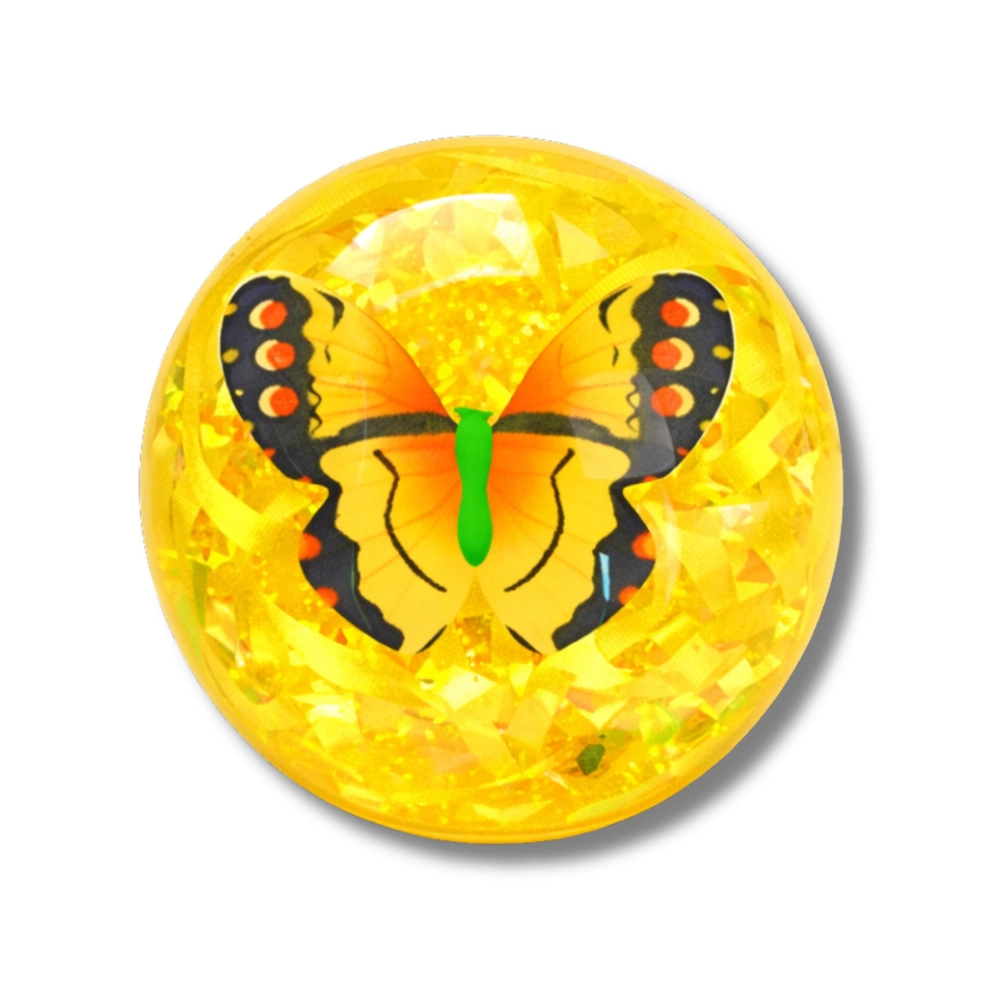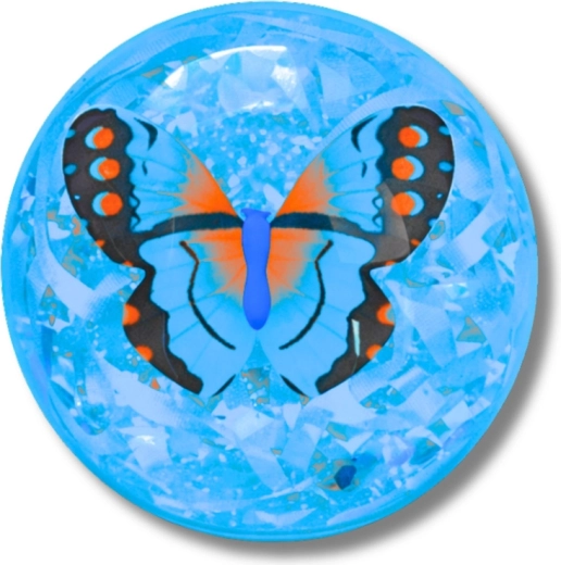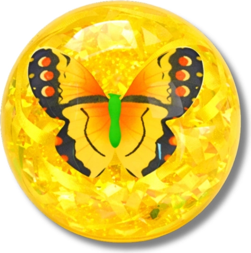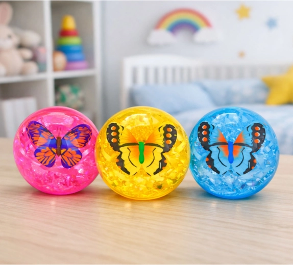 Tento průhledný skákací míček o průměru 9 cm kombinuje světelné efekty a třpytivé konfety s motivem motýla uvnitř. Při každém odrazu začne svítit různými barvami, což vytváří poutavou podívanou a motivuje děti k pohybu.