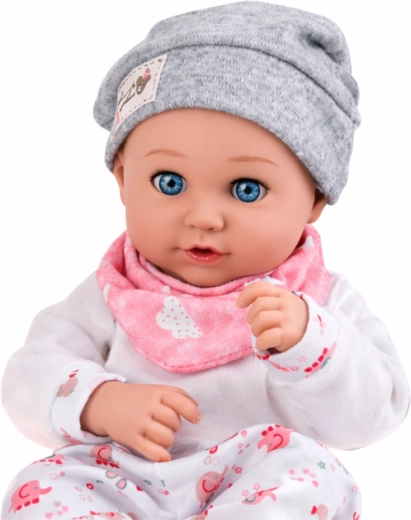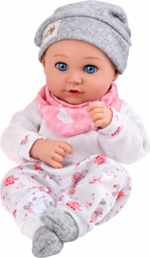 Tato pečlivě zpracovaná panenka napodobuje skutečné miminko – jemné rysy, přátelský výraz a detailní provedení vyvolají u dětí touhu se starat a napodobovat dospělé. Světlý pajac s decentním vzorem, měkká čepička a růžový bryndák krásně ladí v pastelové kombinaci.