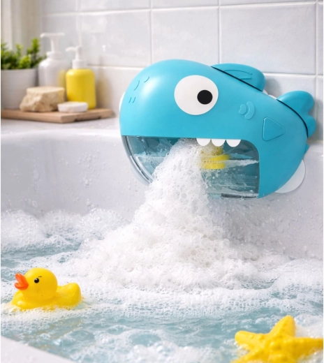 Interaktivní koupací hračka ve tvaru rekina promění rutinní mytí v radostný rituál. Stačí připevnit pomocí přísavek na hladký povrch, doplnit vodu se sprchovým gelem do vyjímatelného zásobníku a jediným stiskem tlačítka spustit výrobu bohaté pěny, která vytéká z tlamy rekina a baví děti po celou dobu koupele.