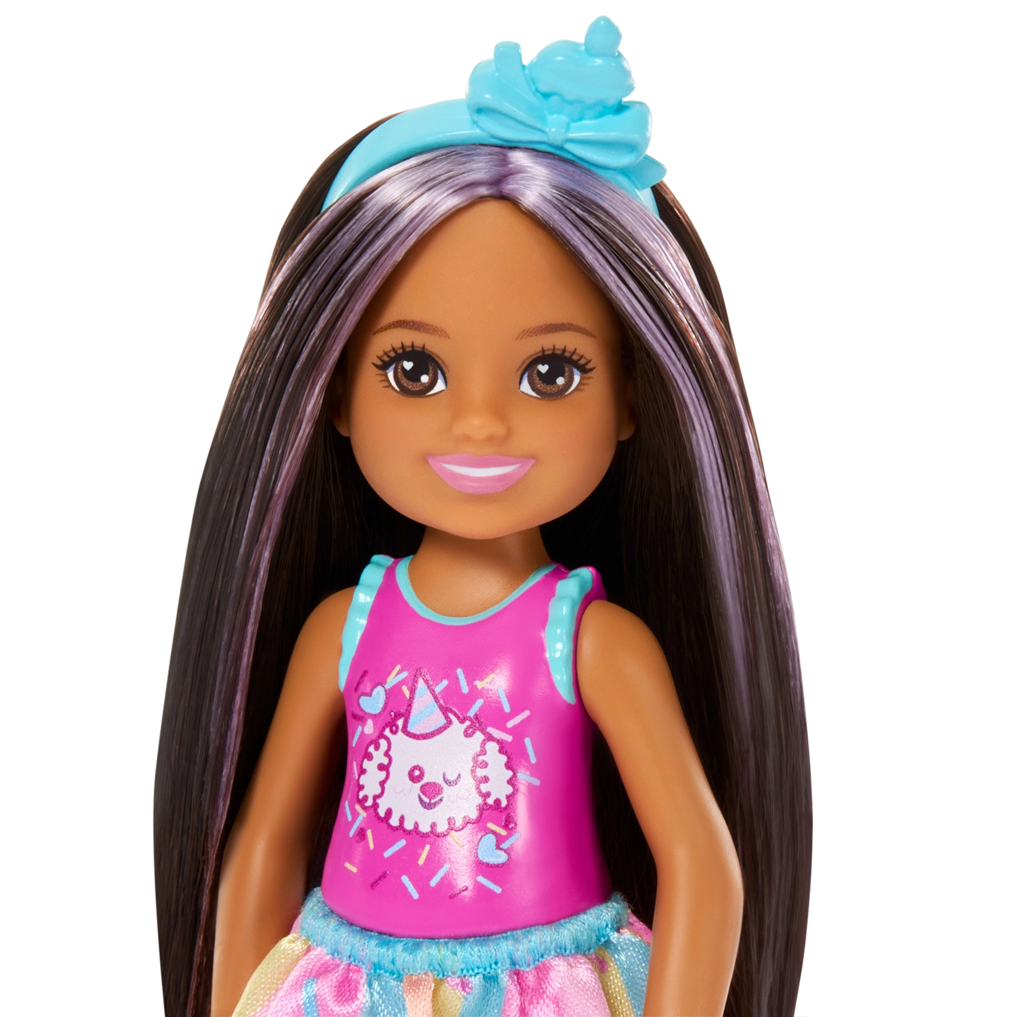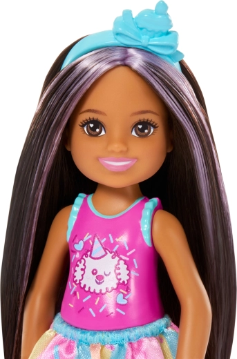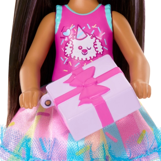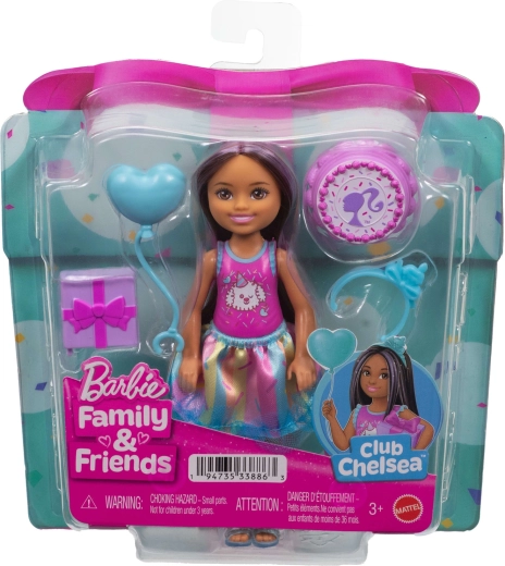 Rozkošná panenka Barbie Club Chelsea přináší narozeninovou zábavu do každé hry. Malá panenka o výšce cca 13 cm má dlouhé tmavé vlasy s fialovými pramínky, nosí roztomilý top se štěňátkem, barevnou sukýnku a světle modré sandálky. Součástí jsou tematické doplňky pro oslavu narozenin – balónek, dáreček, čelenka a dort – které podporují kreativní role-play a vyprávění vlastních příběhů.