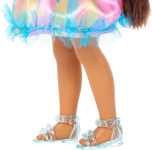 Chelsea nosí top se štěňátkem, vícebarevnou tutu sukýnku a světle modré sandálky. Oblečky jsou snímatelné a vhodné pro módní hraní.