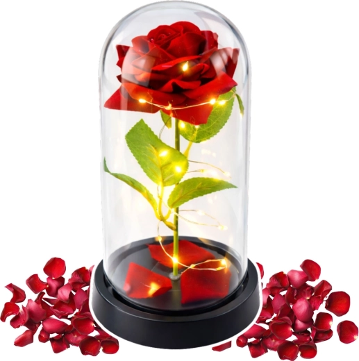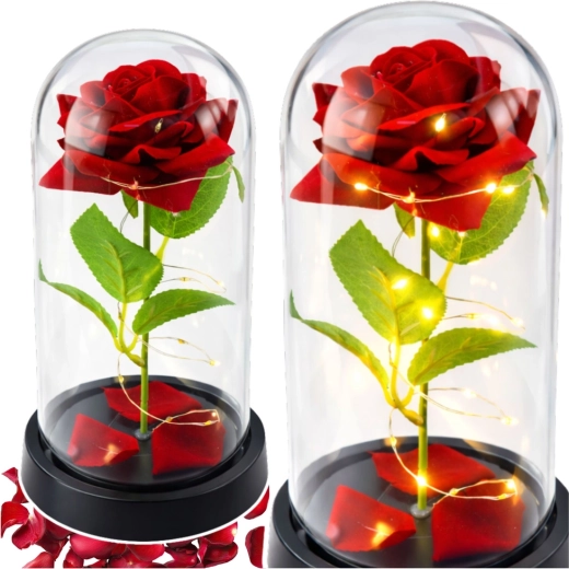 Věčná růže ve skleněné kopuli spojuje klasickou krásu s moderním pojetím. Teplé LED mikro‑světýlka jemně obtáčejí květ a zvýrazňují jeho sytě červený odstín, zatímco čirá skleněná dóza chrání dekoraci před prachem. Stabilní černý podstavec se hodí do obývacího pokoje, ložnice i kanceláře.