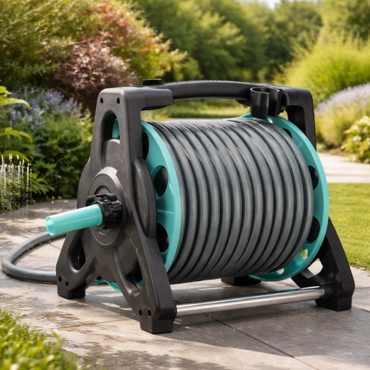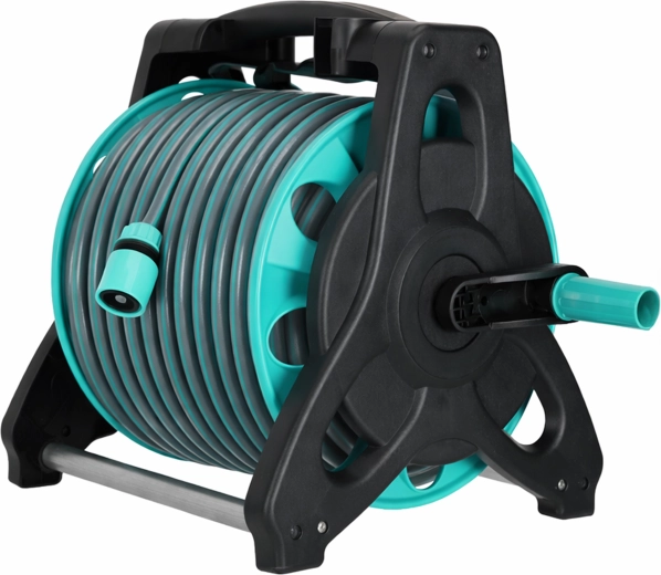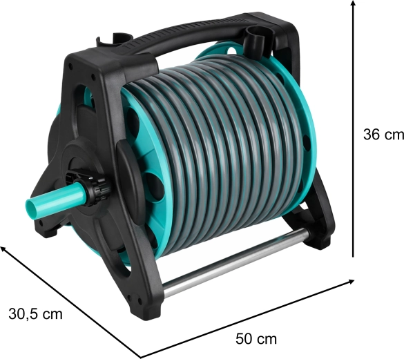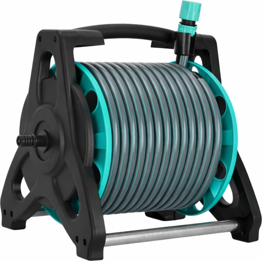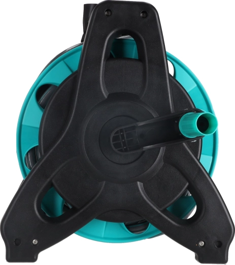 Stabilní rám s korbou a klikou zajistí rychlé navinutí a skladné uložení hadice. Sklopná rukojeť šetří místo při uskladnění i přepravě.