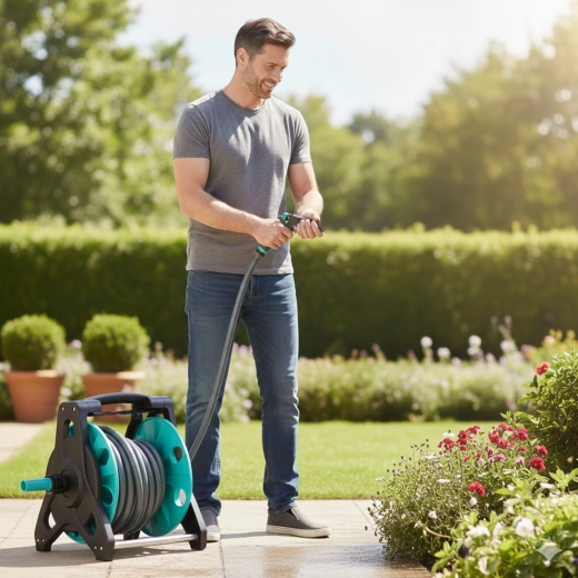 Součástí je vše, co potřebujete k okamžitému použití: přívodní hadice 2 m, rychlospojky, adaptéry i kohoutková přípojka. Naviják udržuje hadici bez překroucení a zalomení, takže zalévání je rychlejší, čistší a efektivnější.