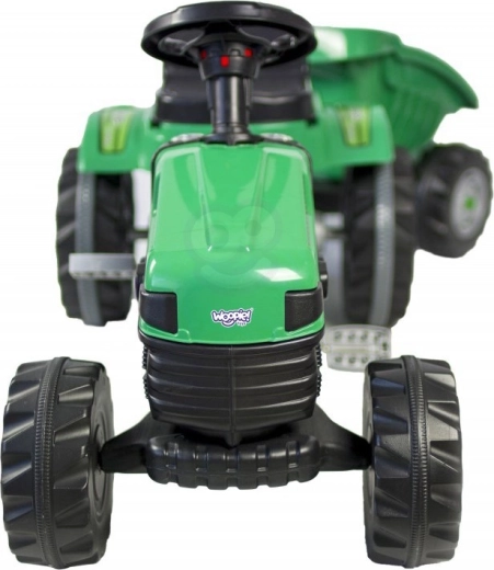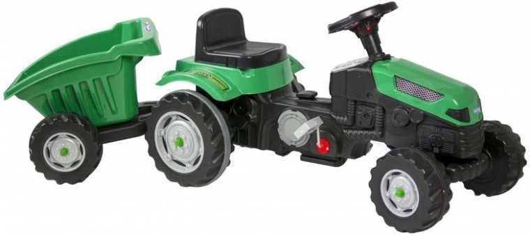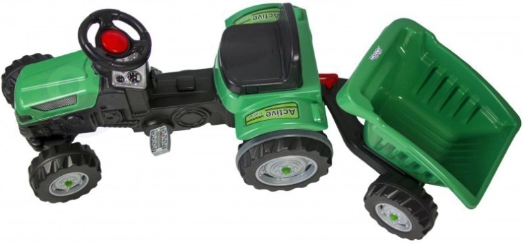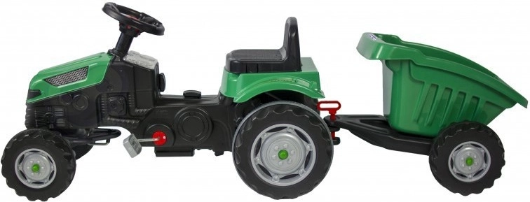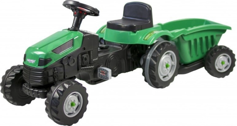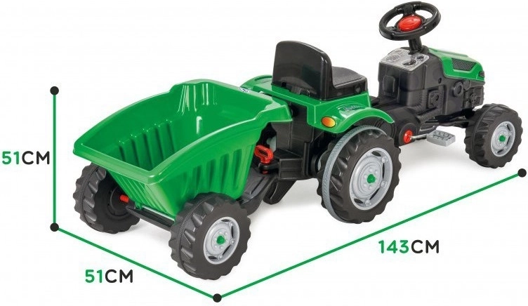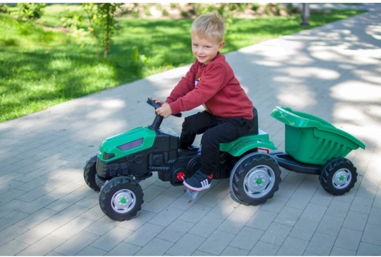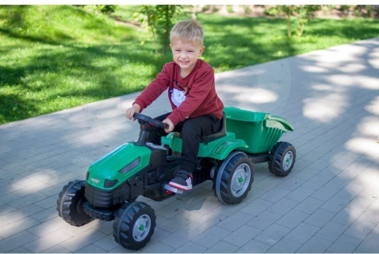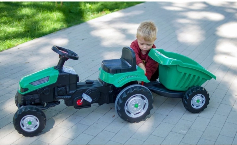 Objevte robustní dětský traktor s realistickým vzhledem, který podporuje rozvoj motoriky i fantazie. Díky přesnému řízení, klaksonu na volantu a otočné přední nápravě je manévrování snadné i pro menší děti. Odnímatelný přívěs/korba umožní vozit hračky, písek nebo větvičky – ideální pro malé zahradníky.