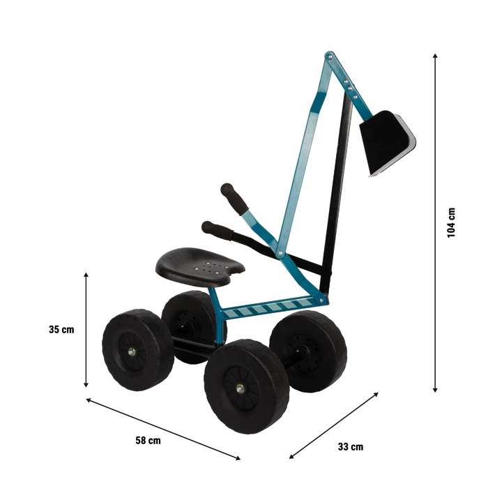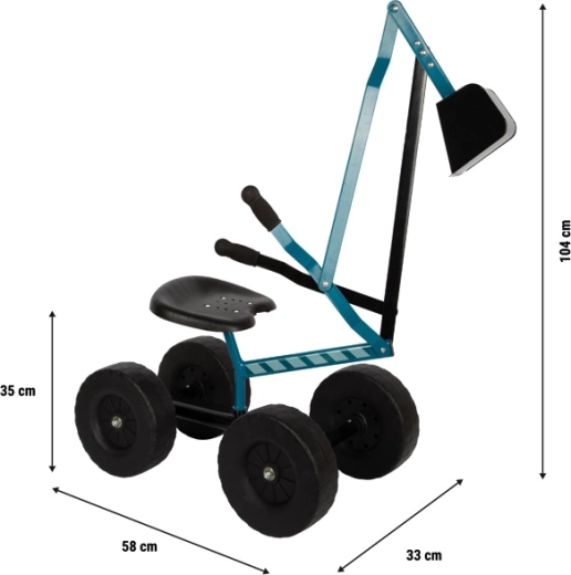 Sedlo ve výšce 35 cm a ergonomicky tvarované rukojeti jsou přizpůsobeny dětským rukám, aby byla jízda i bagrování pohodlné a intuitivní. Ideální pro zahradu a pískoviště, motivuje k aktivnímu pohybu venku a rozvíjí prostorovou představivost i týmovou hru.