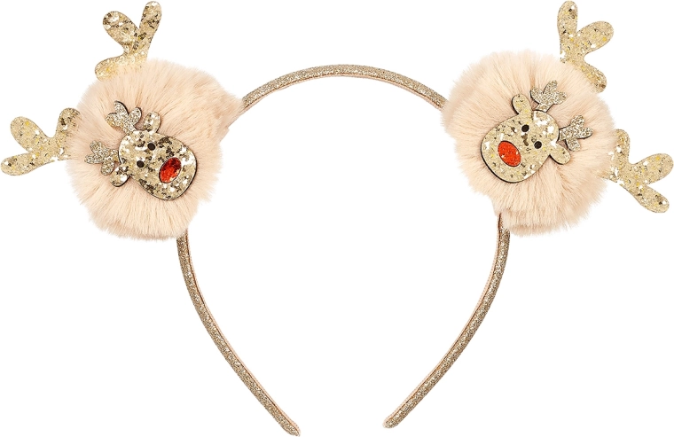 Vneste do svátečních dní kouzelnou atmosféru s elegantní čelenkou SOUZA. Díky tenké 0,8cm kovové základně potažené třpytivou stuhou se příjemně nosí a drží tvar po celý den. Dvě hebké béžové bambulky s aplikací roztomilých sobíků a parohy posypanými zlatými třpytkami dodají každému účesu hravý, ale stále vkusný vzhled.