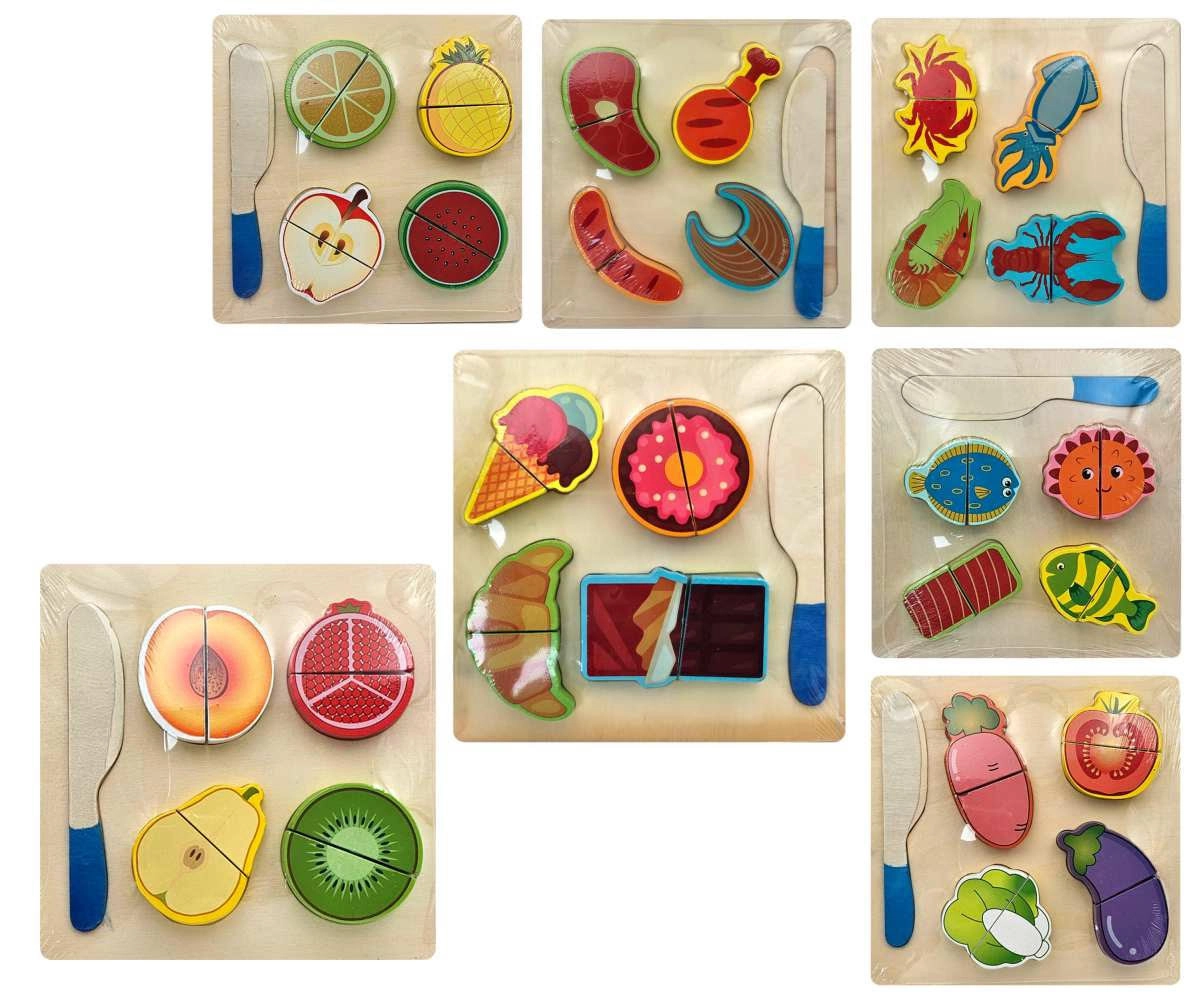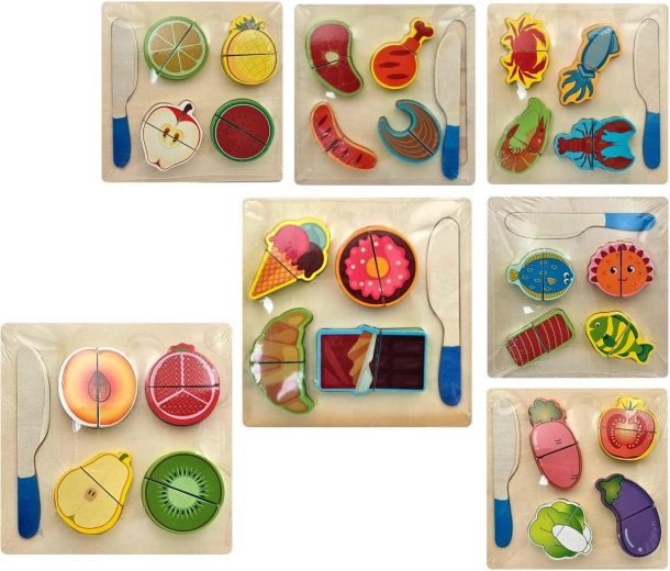 Sada je dostupná v několika motivech, například ovoce, zelenina či pečivo. Každý kus je vyroben z odolného dřeva s hladkými hranami pro bezpečnou hru. Cena platí za jeden kus/variant – ideální pro postupné rozšiřování dětské sbírky potravin.