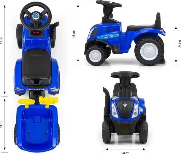 Objevte zábavu na dvoře i doma s odrážedlem NEW HOLLAND T7. Kvalitní plastová konstrukce, kovové osy kol a ochrana proti převrácení dozadu zajišťují bezpečnou jízdu. Děti si snadno osvojují koordinaci a rozvíjejí motoriku díky intuitivnímu řízení a stabilnímu posedu s pohodlným sedadlem a opěrkou.