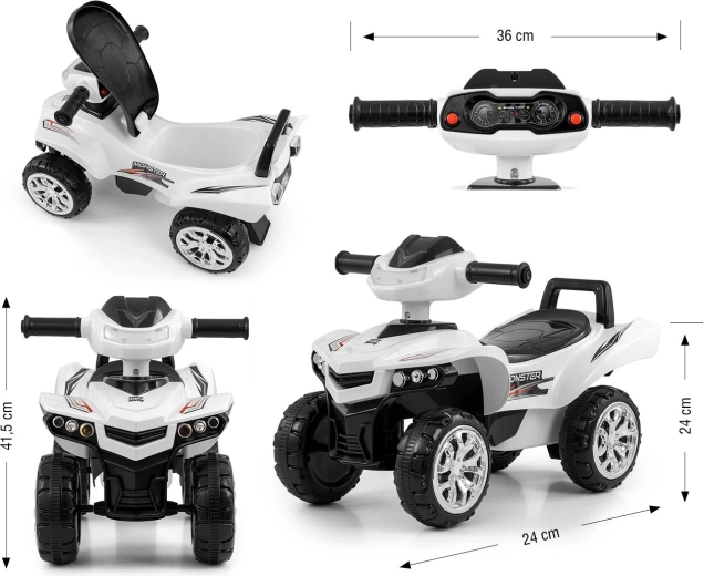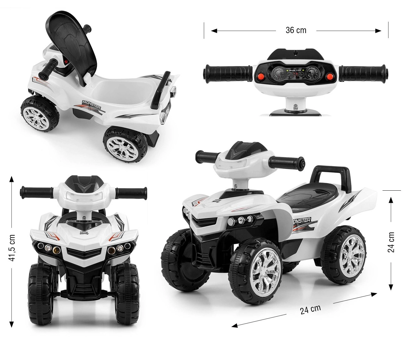 Odrážedlo Monster potěší všechny malé řidiče i řidičky, kteří milují aktivní pohyb. Robustní konstrukce, široké pneumatiky a ergonomicky tvarované sedlo zajišťují stabilní a pohodlnou jízdu na různých površích. Interaktivní volant s hudebním panelem a světelnými efekty motivuje děti k delší hře a zároveň rozvíjí jejich smysly.