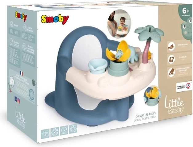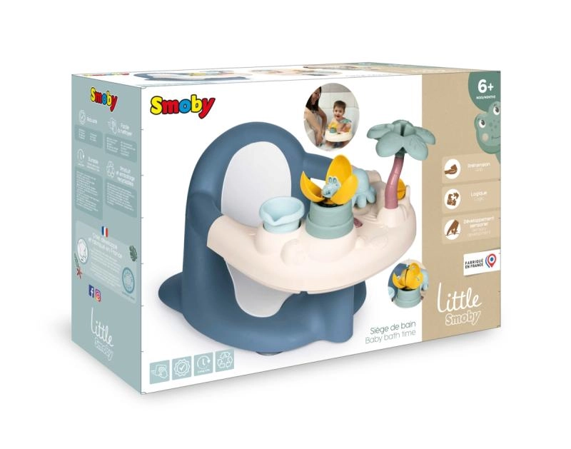 Součástí je interaktivní hrací pultík s 5 vodními aktivitami, které rozvíjejí smysly a jemnou motoriku: vodní mlýnek, kelímek na nalévání, palmový rozprašovač, „kouzelná“ květina a chobotnice stříkající vodu. Čtyři silné přísavky pevně drží sedátko na dně vany pro maximální stabilitu. Vyrobeno ve Francii.