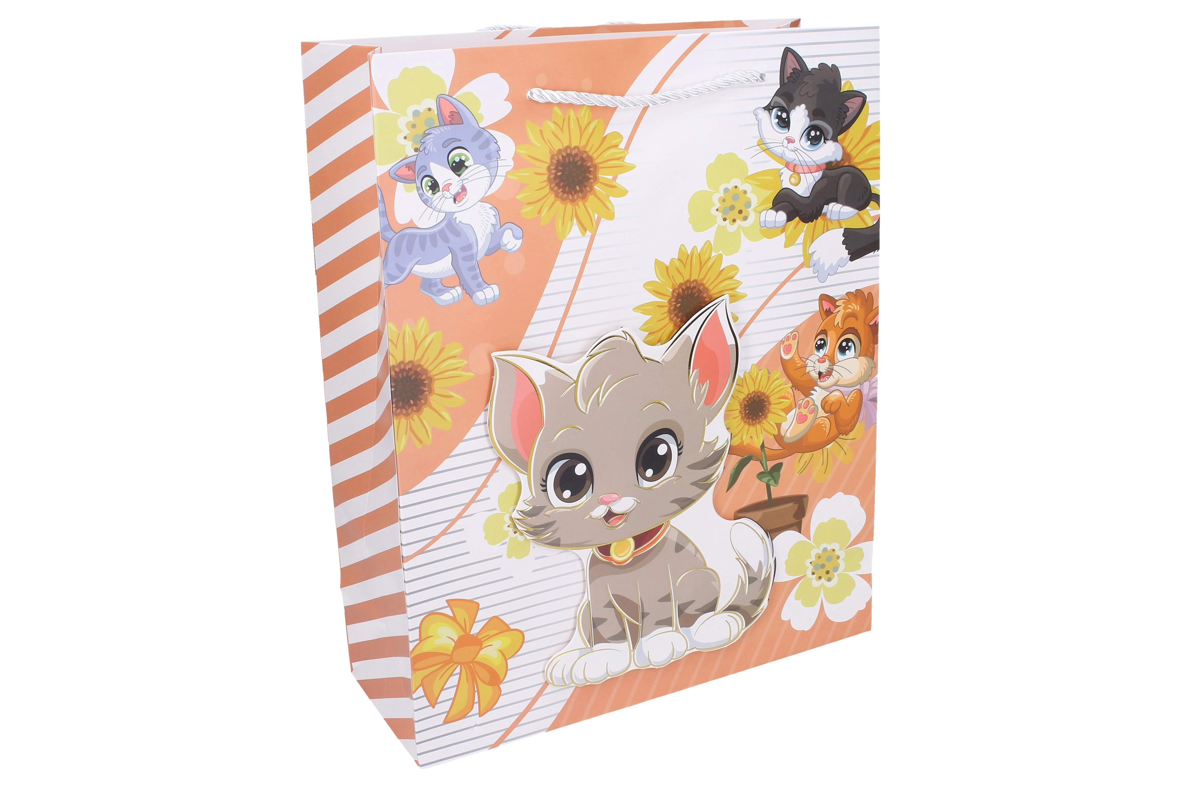 Veselé ilustrace koťátek a květin na pruhovaném podkladu dodají balení prémiový vzhled a sváteční atmosféru.