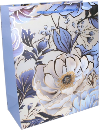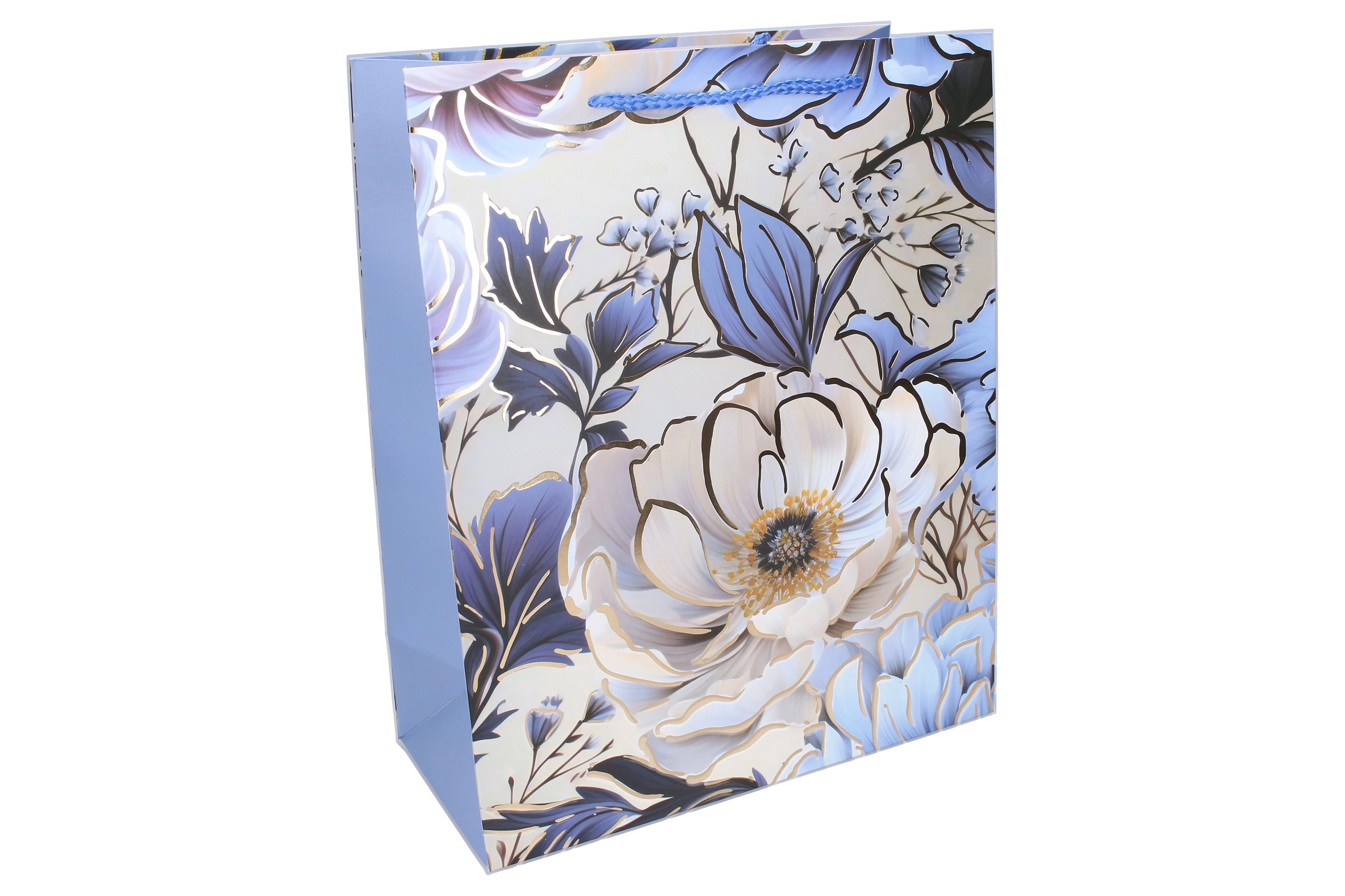 Tato celoroční dárková taška v kompaktní velikosti S je perfektní volbou pro elegantní předání dárků. Kvalitní papír, zpevněné dno a boky a pohodlná ucha zajišťují jistý úchop i při vyšší zátěži. Květinové potisky v pastelových a modrých tónech s jemnými zlatými detaily dodají dárku výjimečný vzhled.