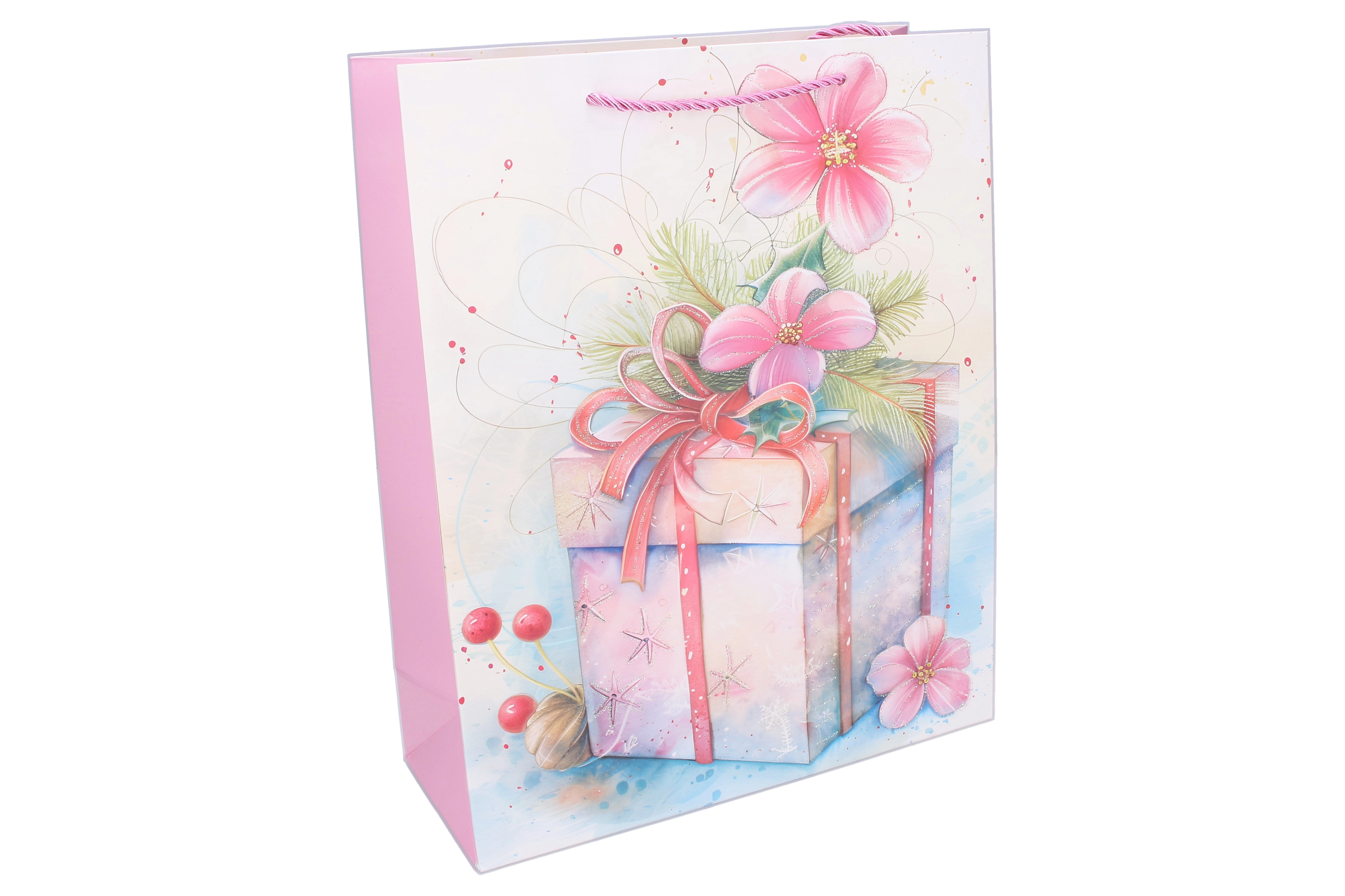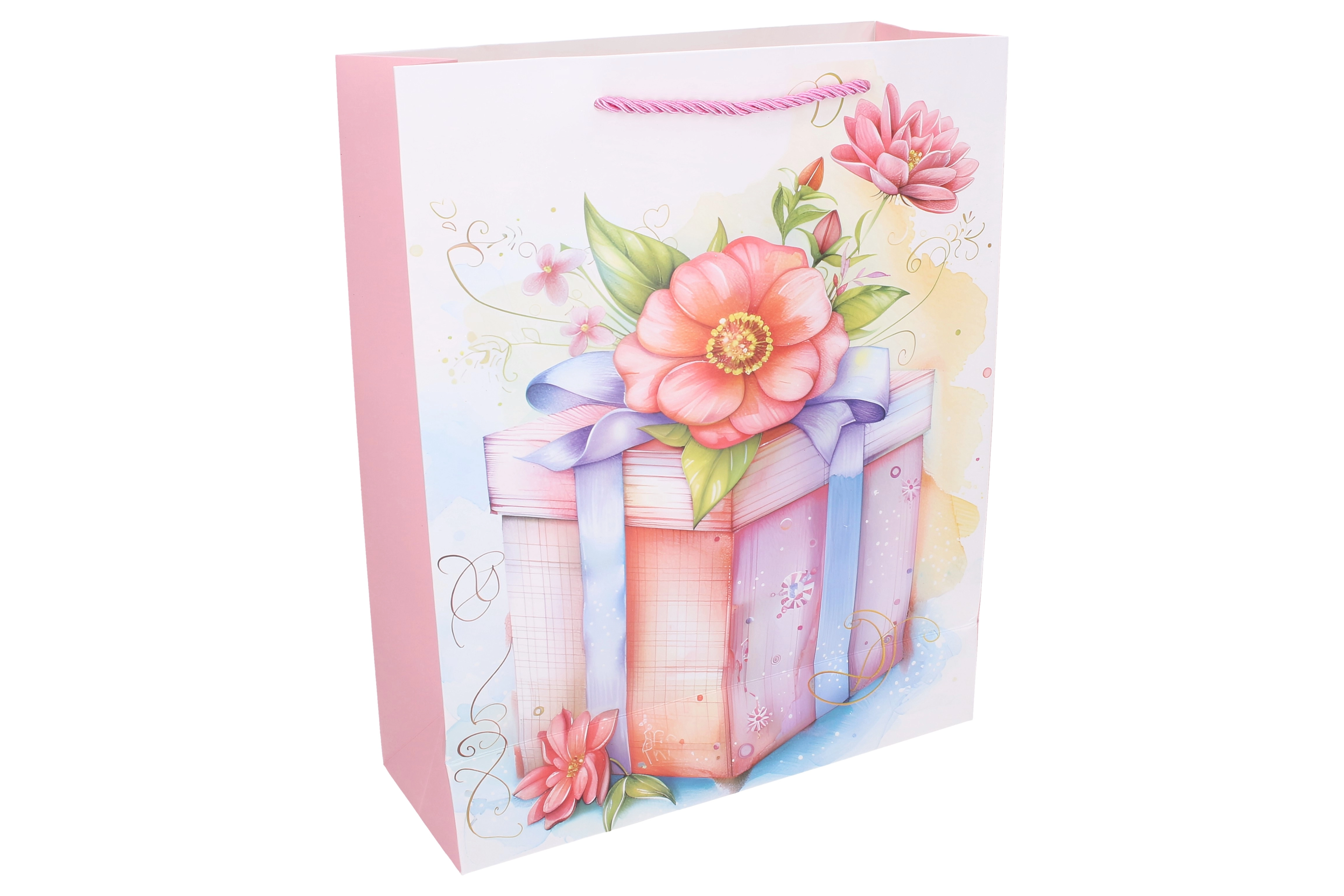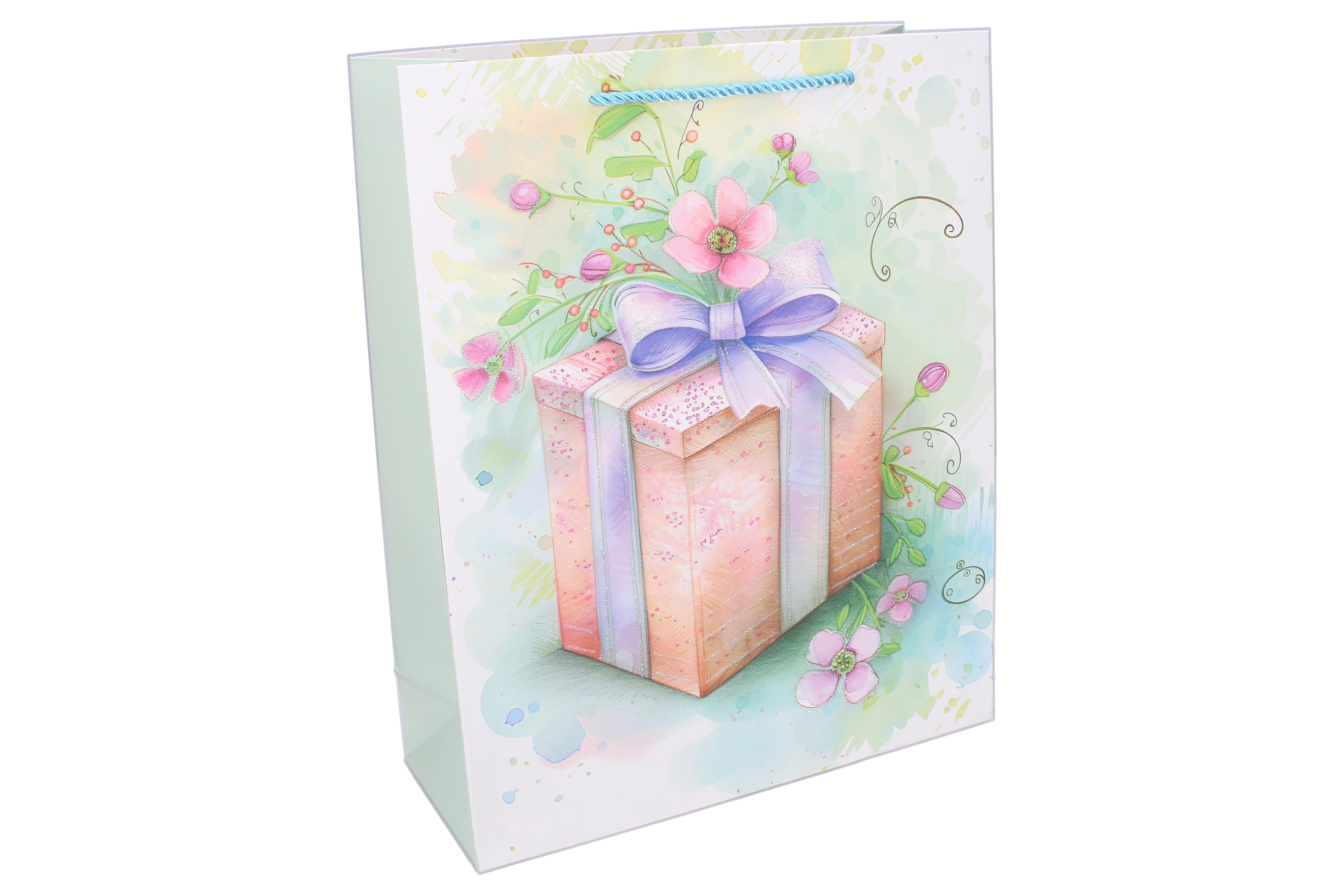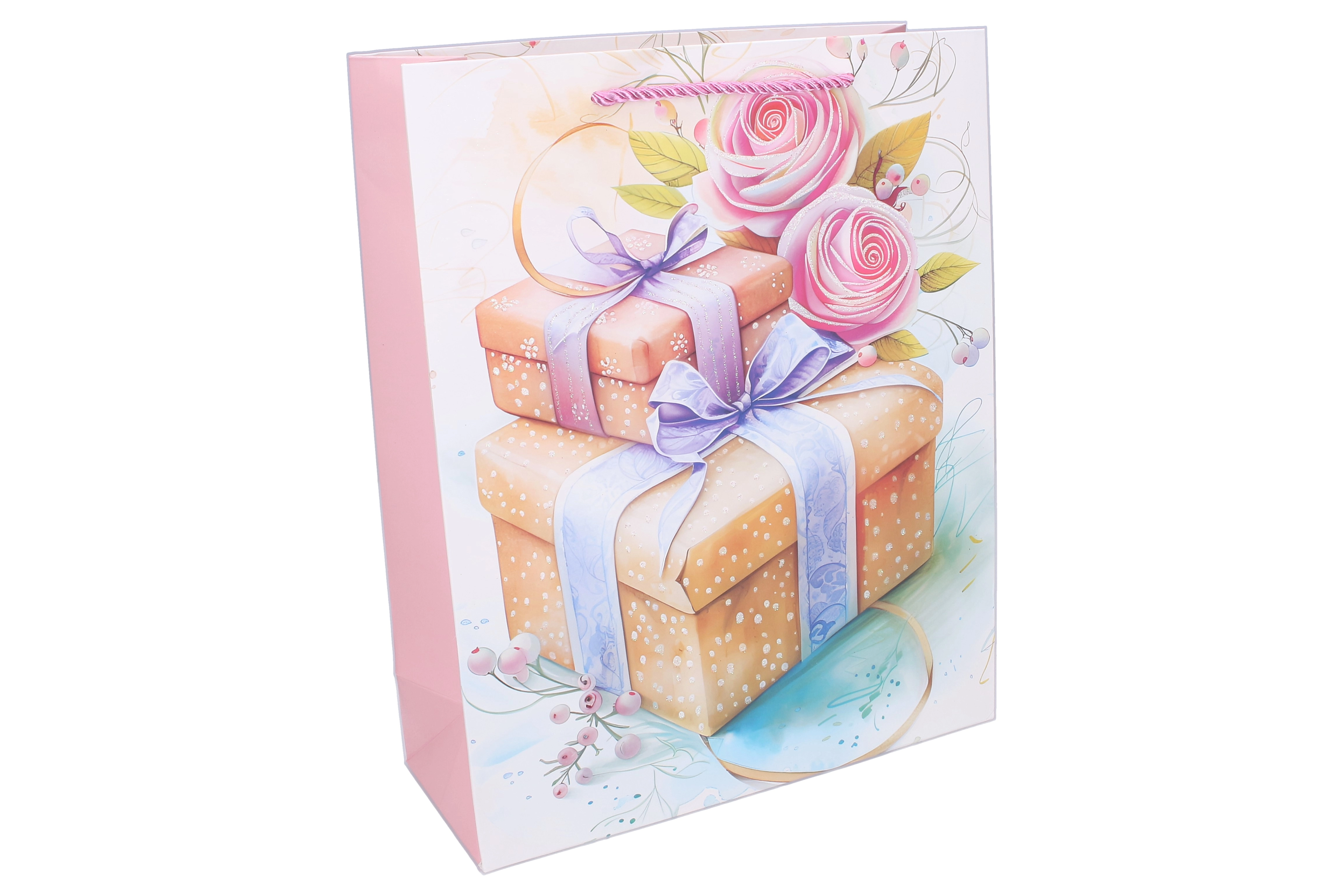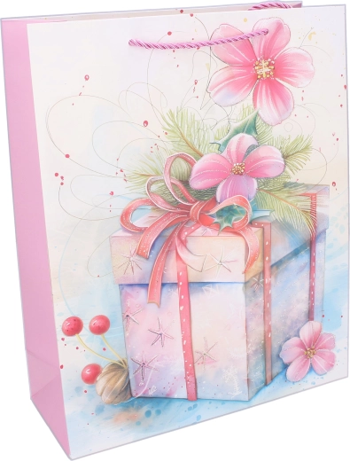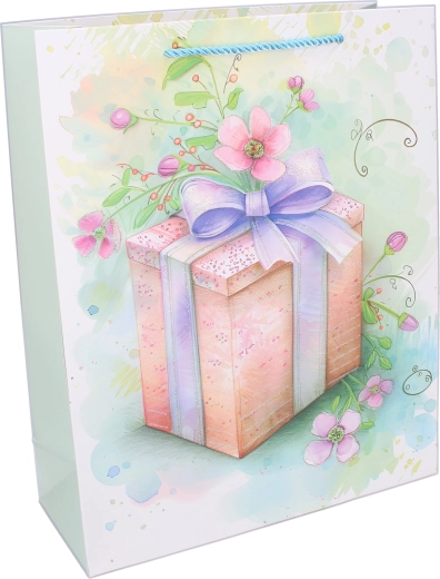 Tato elegantní dárková taška s celoročním motivem usnadní balení dárků a zároveň zaujme svým vzhledem. Kvalitní papírový materiál a pevná kroucená ucha zaručují pohodlné a bezpečné přenášení. Lesklý potisk s ilustracemi dárků, květin a stuh dodá vašemu překvapení slavnostní nádech.