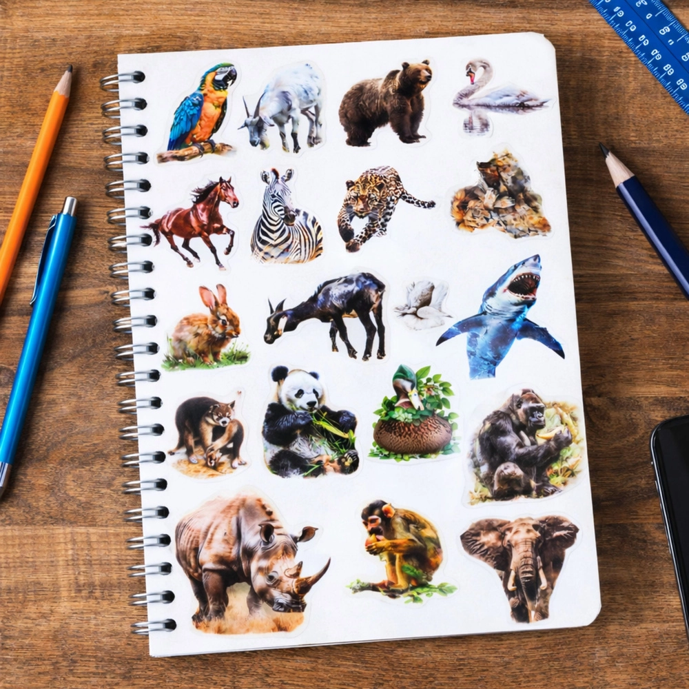 Objevte zábavnou sadu 50 samolepek s motivy divokých zvířat o velikosti cca 6 cm. Mají hladký povrch a průhledné pozadí, takže skvěle splynou s jakýmkoli podkladem. Ideální pro dekoraci sešitů, deníků, scrapbookingu i tvořivé projekty dětí.