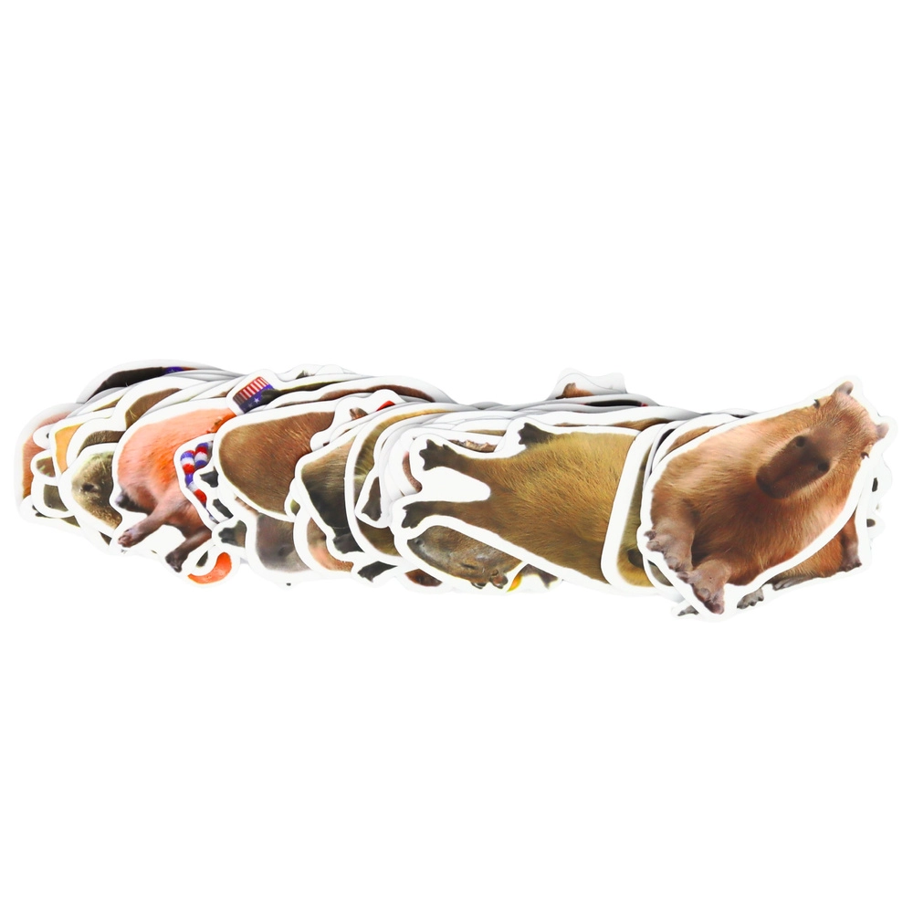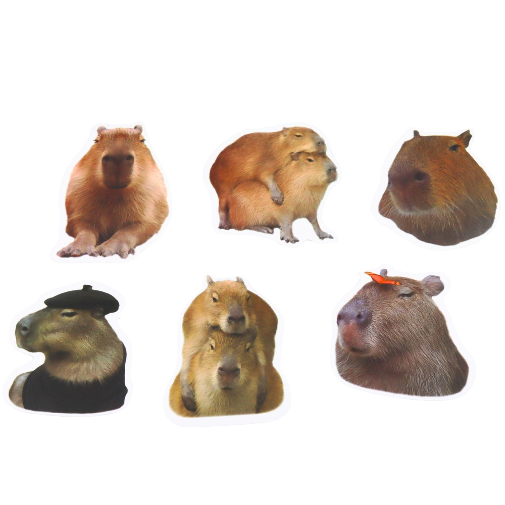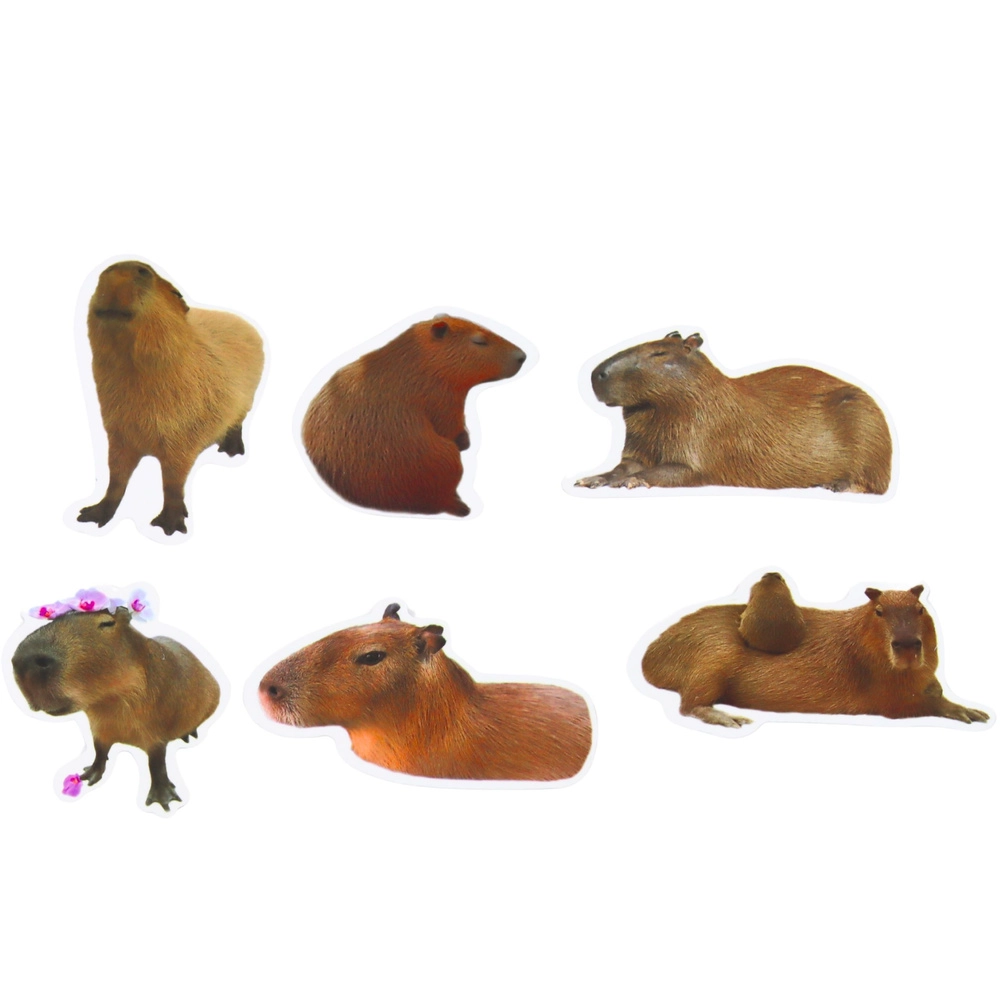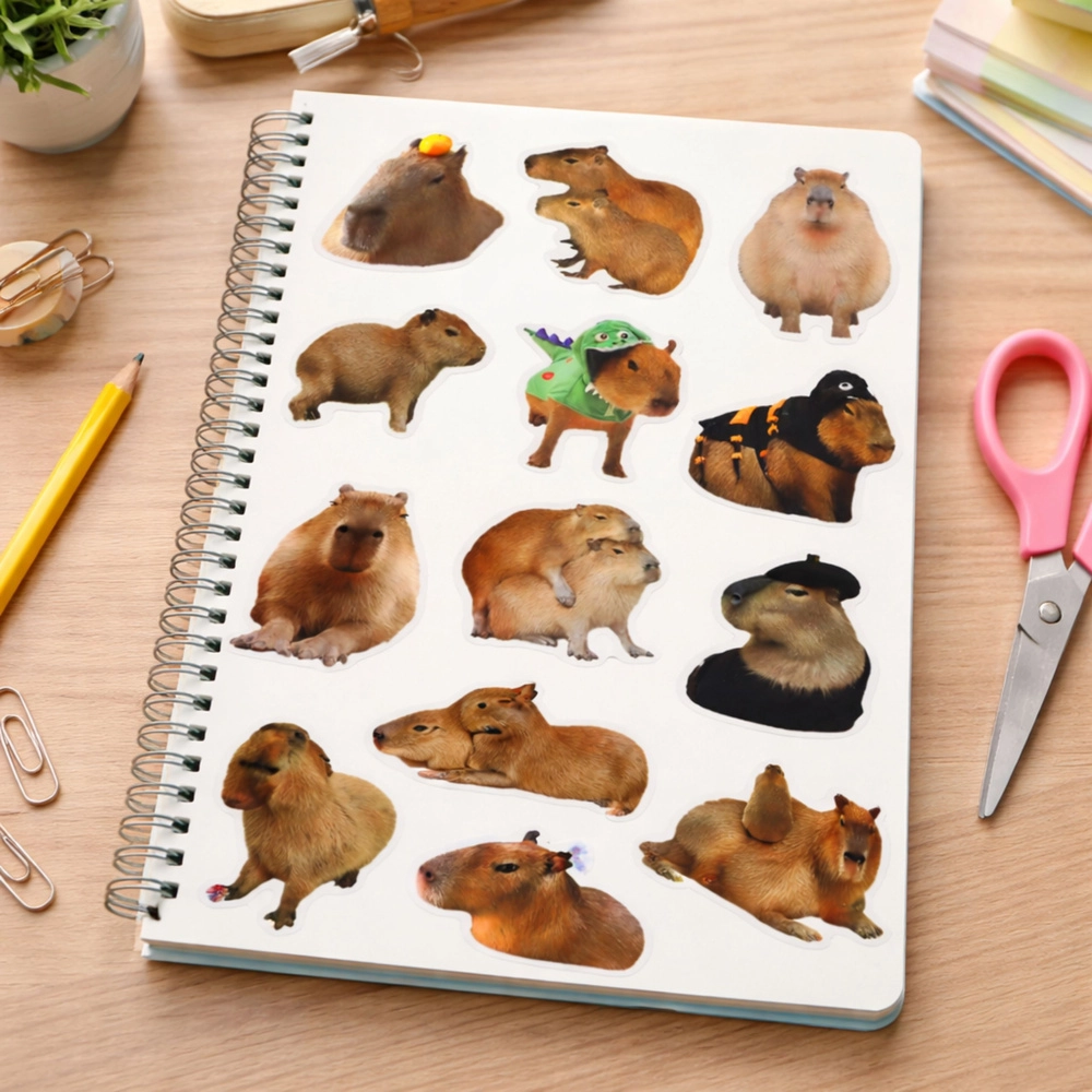 Každá samolepka vychází z reálných podob kapybar – přírodní odstíny, různé pózy a detailní zpracování pro autentický dojem na každém projektu.