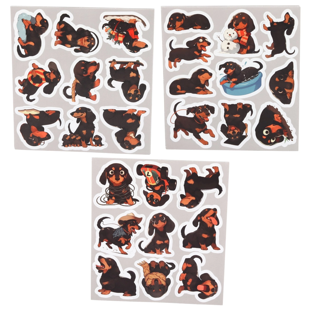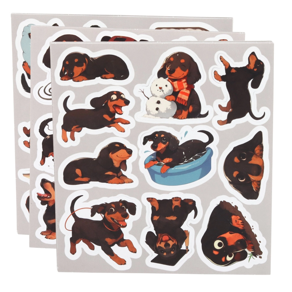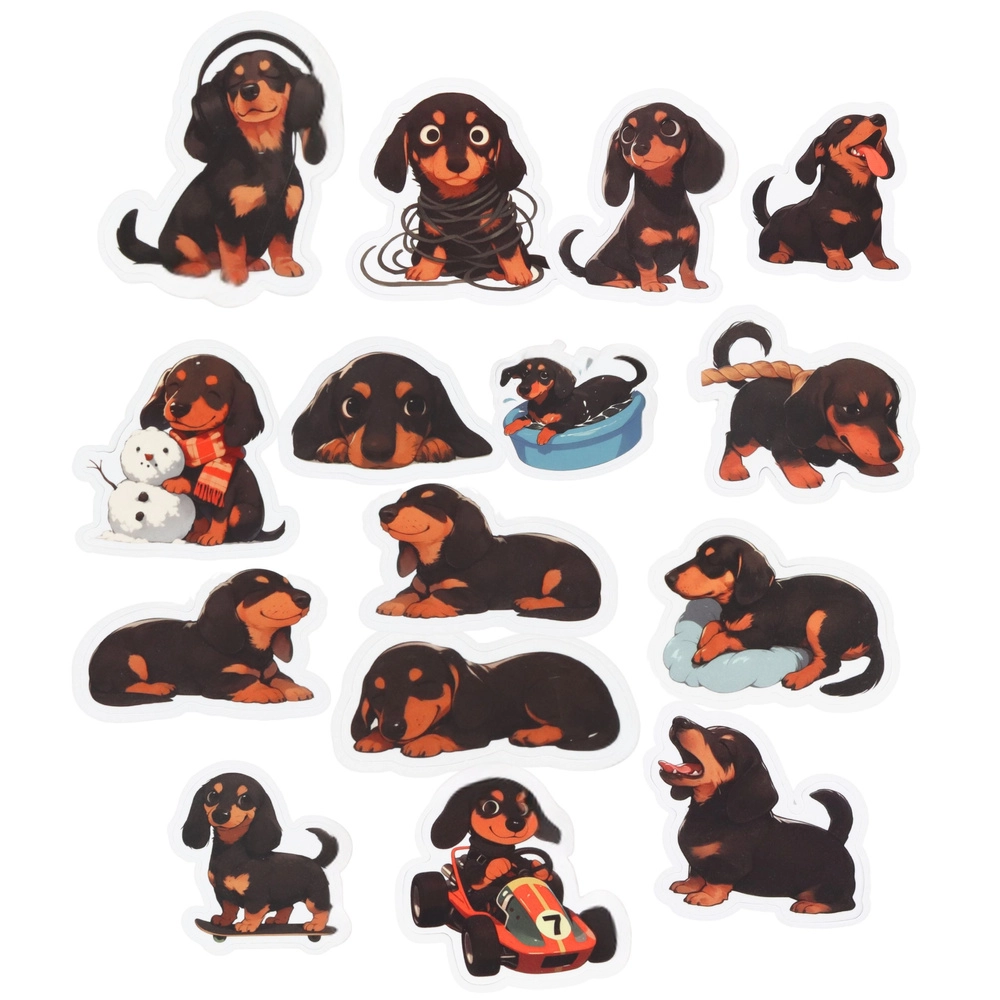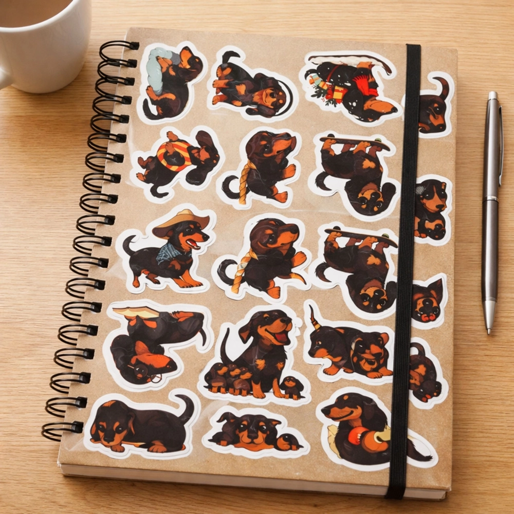 Roztomilá sada samolepek s motivem jezevčíků přináší 54 různých designů pro zdobení sešitů, deníků, plánovačů či dárků. Každá samolepka zobrazuje jezevčíka v jiné póze, díky čemuž snadno vytvoříte originální kompozice. Samolepky jsou snadno odlepitelné a přilnavé, mají praktickou velikost cca 5–6 cm a skvěle drží na hladkých površích.