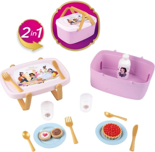 Kouzelný piknikový koš s motivy DISNEY PRINCESS potěší všechny malé princezny. Díky chytrému řešení 2 v 1 rychle přejdete z přenosného košíku na stabilní stoleček – ideální na hraní doma i na cestách. Bohatá sada nádobí a dobrot podněcuje fantazii a rozvíjí sociální dovednosti při hře na servírování.