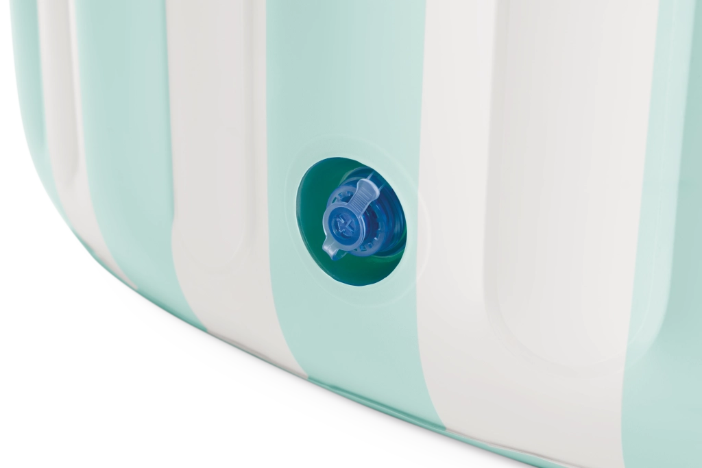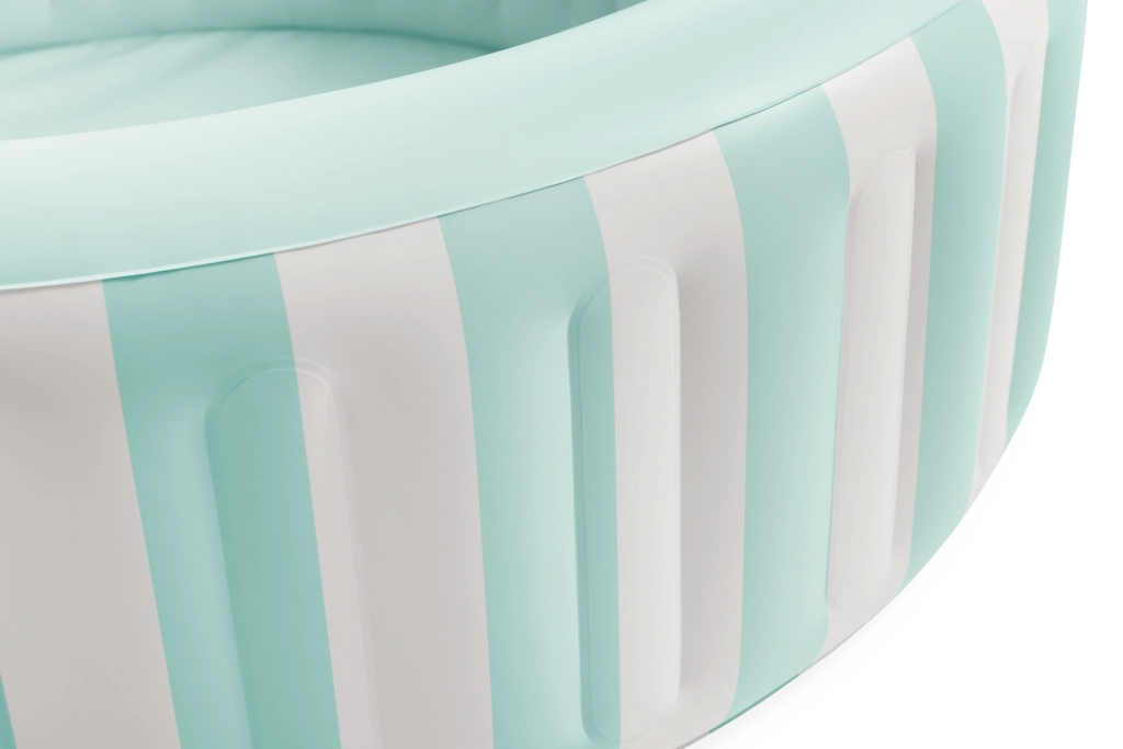 Nafukovací bazének Coastal Luxe v moderním přímořském designu je ideální pro letní vodní hry menších dětí. Vertikální pruhy ve světle tyrkysové a bílé barvě působí svěže, zatímco hladký vnitřní povrch v jemné tyrkysové barvě navozuje pocit čistoty a klidu. Odolné PVC a vícekomorové stěny poskytují stabilitu i pohodlí při sezení a hraní.