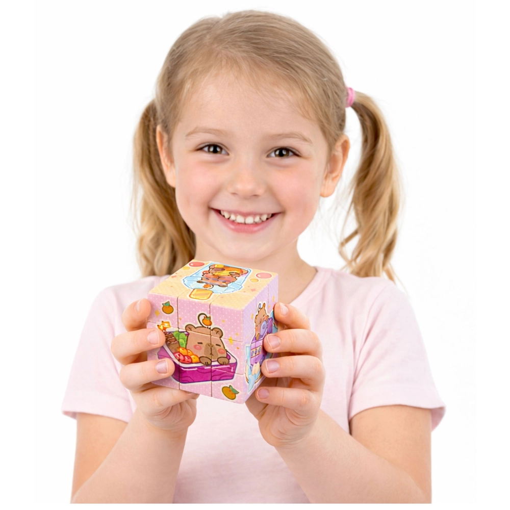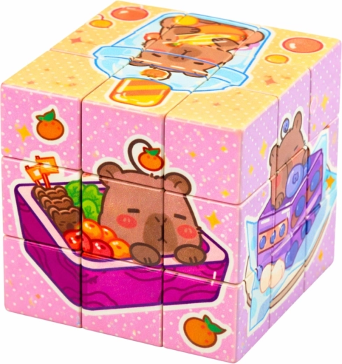 Tato barevná logická kostka s motivem kapybary je skvělou první hlavolamovou hračkou pro nejmenší. Děti otáčením a překládáním segmentů skládají na jednotlivých stranách roztomilé obrázky, čímž si přirozeně trénují postřeh a trpělivost. Díky hladkým povrchům a příjemné velikosti se kostka snadno drží a motivuje ke hře znovu a znovu.