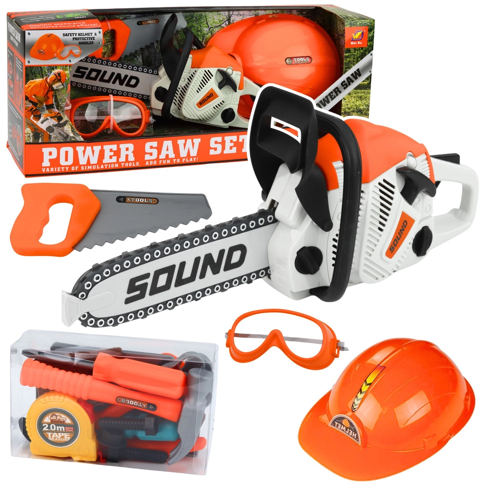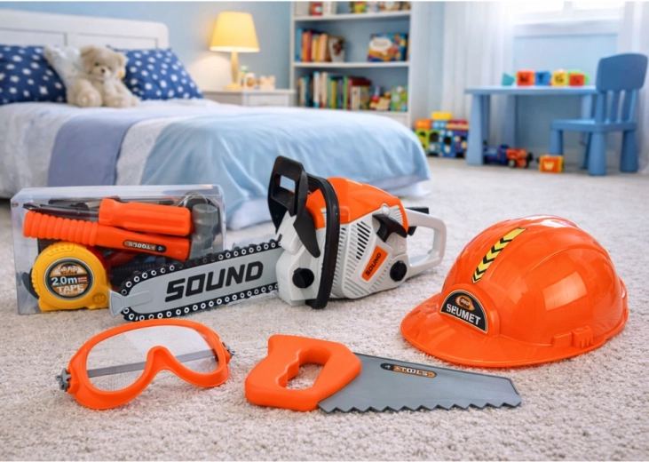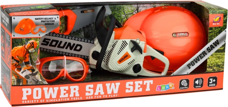Tento promyšlený set umožní dětem napodobovat dospělé při zahradních pracích a drobných opravách. Hlavní atrakcí je hračková motorová pila s otáčejícím se řetězem, zvuky, ručním startérem a tlačítkem spuštění, které věrně napodobují skutečný nástroj — avšak v bezpečné dětské podobě.