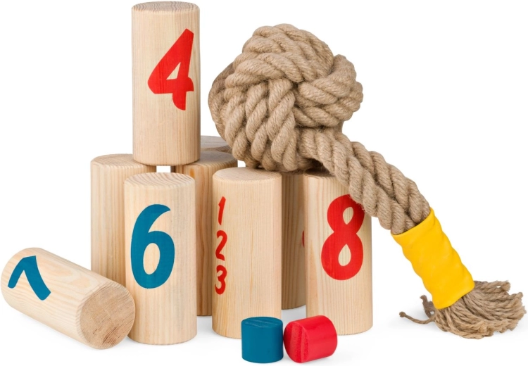 Objevte svižnou a napínavou rodinnou hru pro 2–6 hráčů od 8 let. Pomocí házecího uzlu shazujete očíslované dřevěné kolíky a sbíráte body – vyhrává ten, kdo jako první dosáhne přesně 30 bodů nebo shodí všechny kolíky své barvy. Hra je ideální na zahradu i do parku, podporuje hrubou motoriku, strategické myšlení a aktivní hraní venku. Dřevo pochází z odpovědně obhospodařovaných lesů.