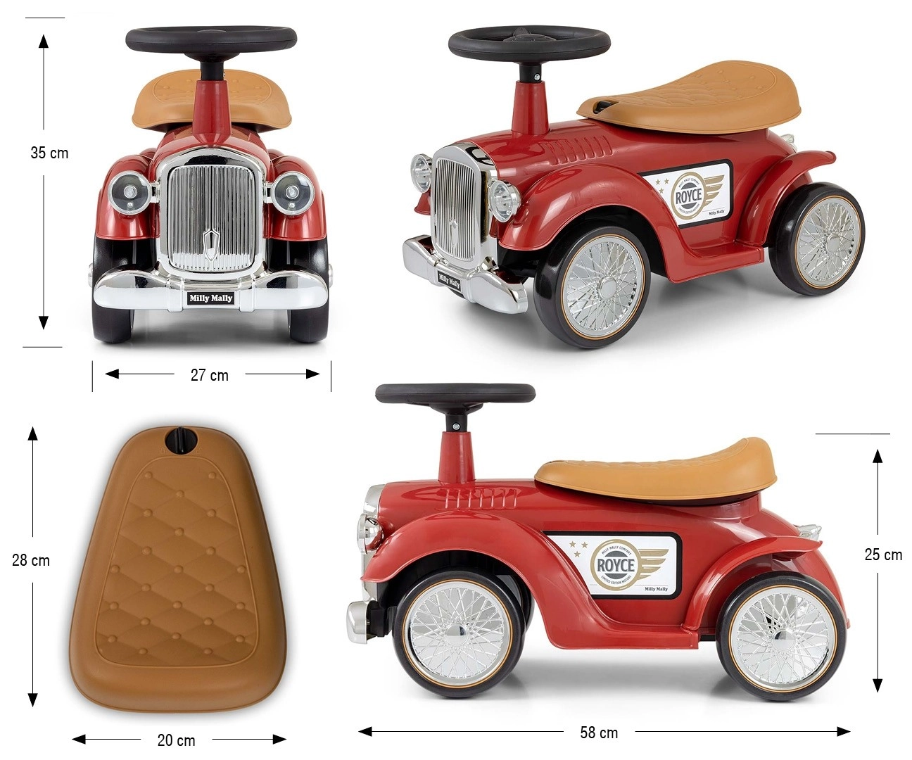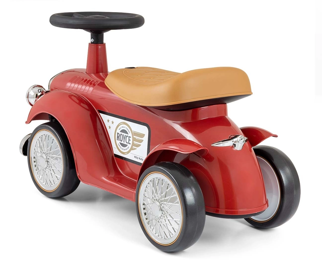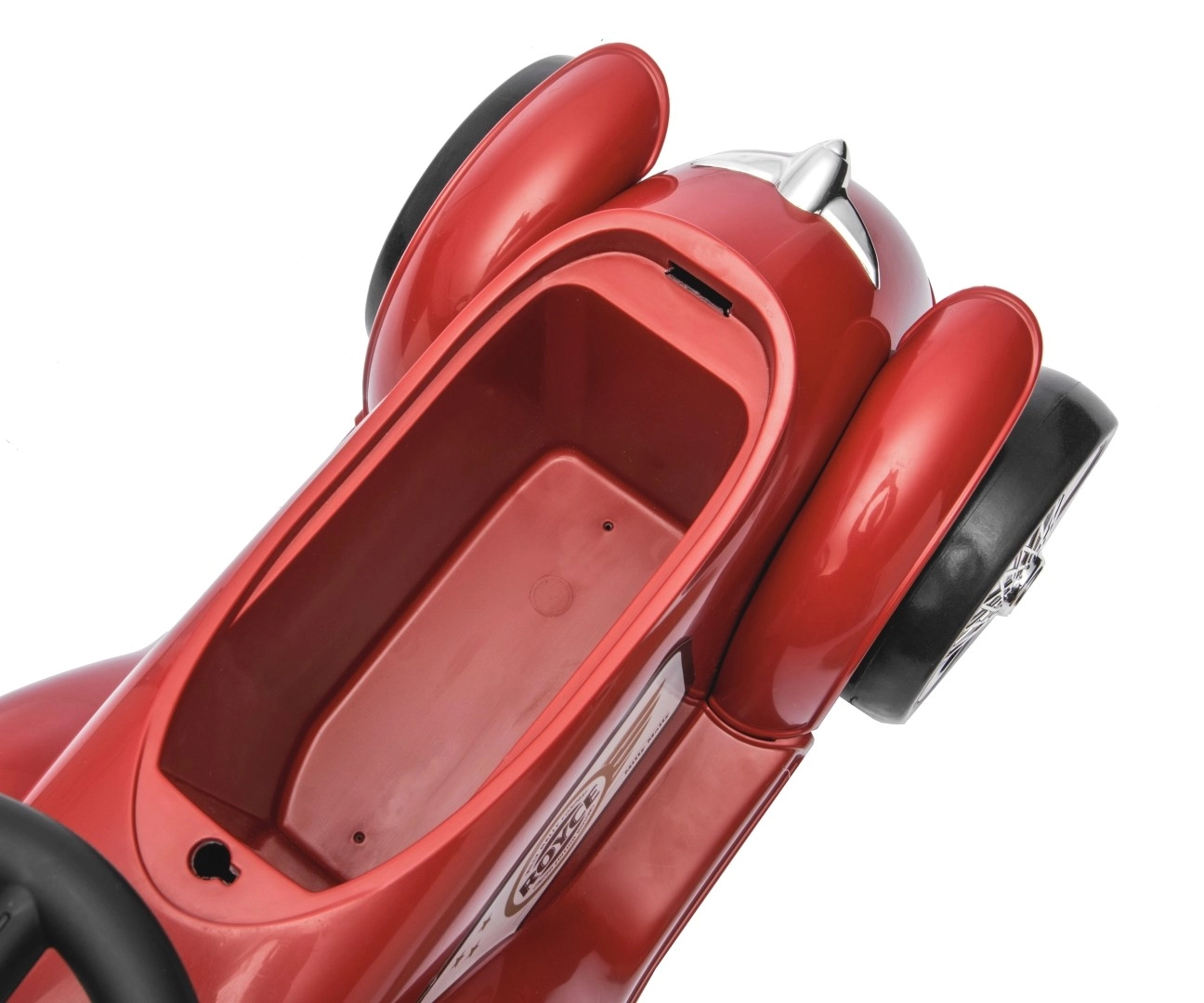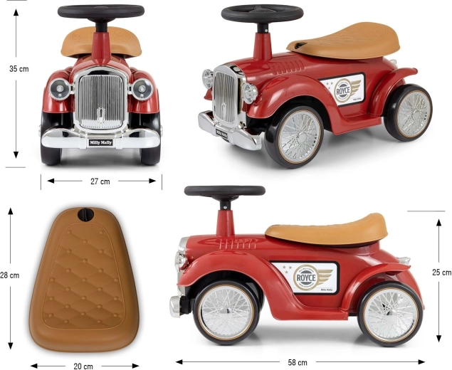 Volant s omezením rejdu pomáhá předcházet převrácení a klakson potěší každého malého milovníka aut. Pod sedlem se ukrývá praktický úložný prostor na drobnosti. Chromovaný přední „gril“ a retro detaily s logem ROYCE dodávají hračce punc nadčasového stylu.