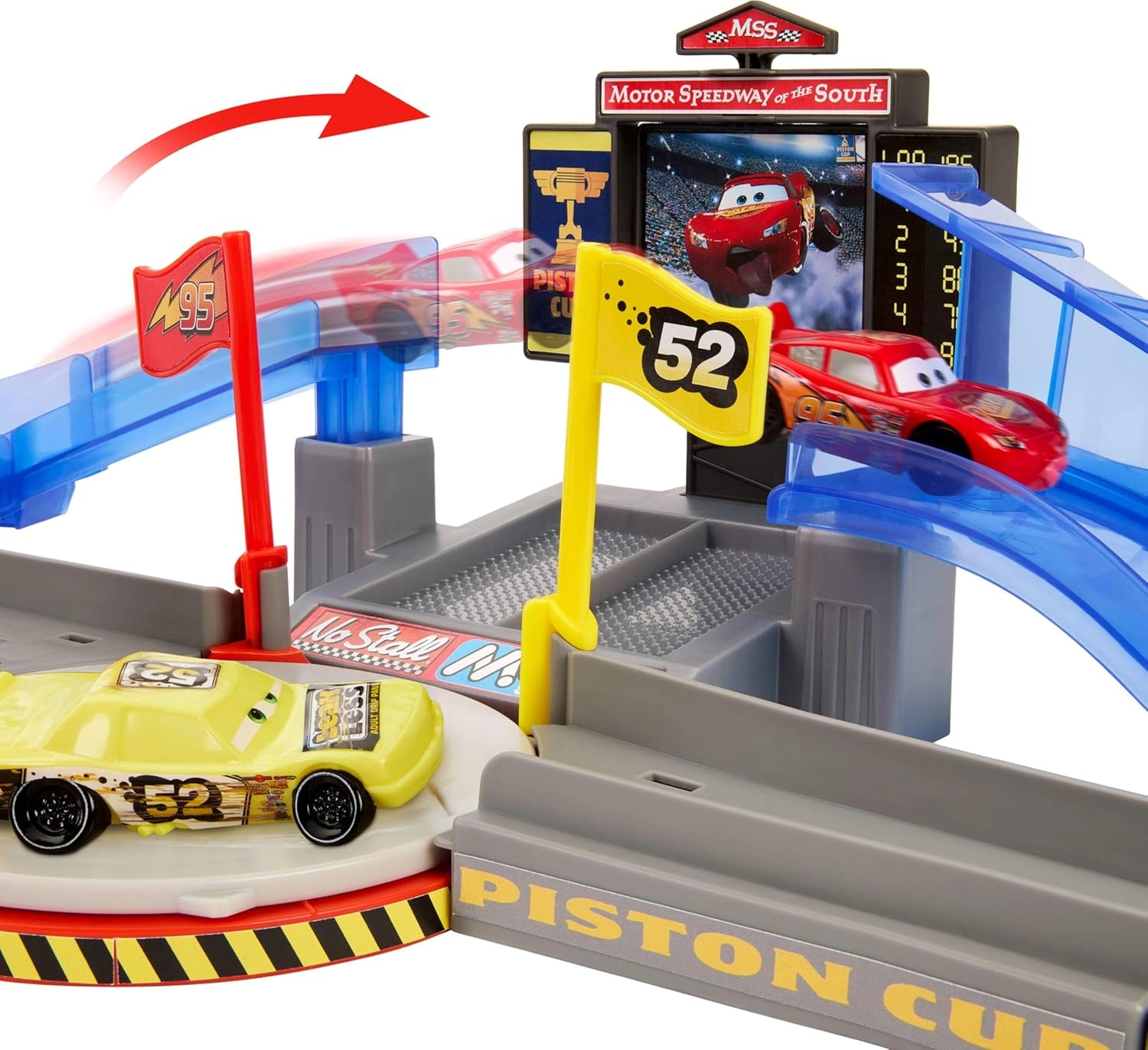 Zažijte filmové momenty přímo doma. V režimu kraksny roztočíte žlutou značku a připravíte zónu střetu. Umístěte Bleska McQueena do vystřelovače a zamiřte – správný odpal znamená plynulou jízdu bez překážek, jinak dojde k efektní srážce se „zmačkaným“ autem. V závodním režimu přepněte výhybku, vystřelte po rampě a sledujte parádní skok kaskadéra. Otočná obrazovka promítne hrdinu na „telebimu“ pro ještě větší napětí.