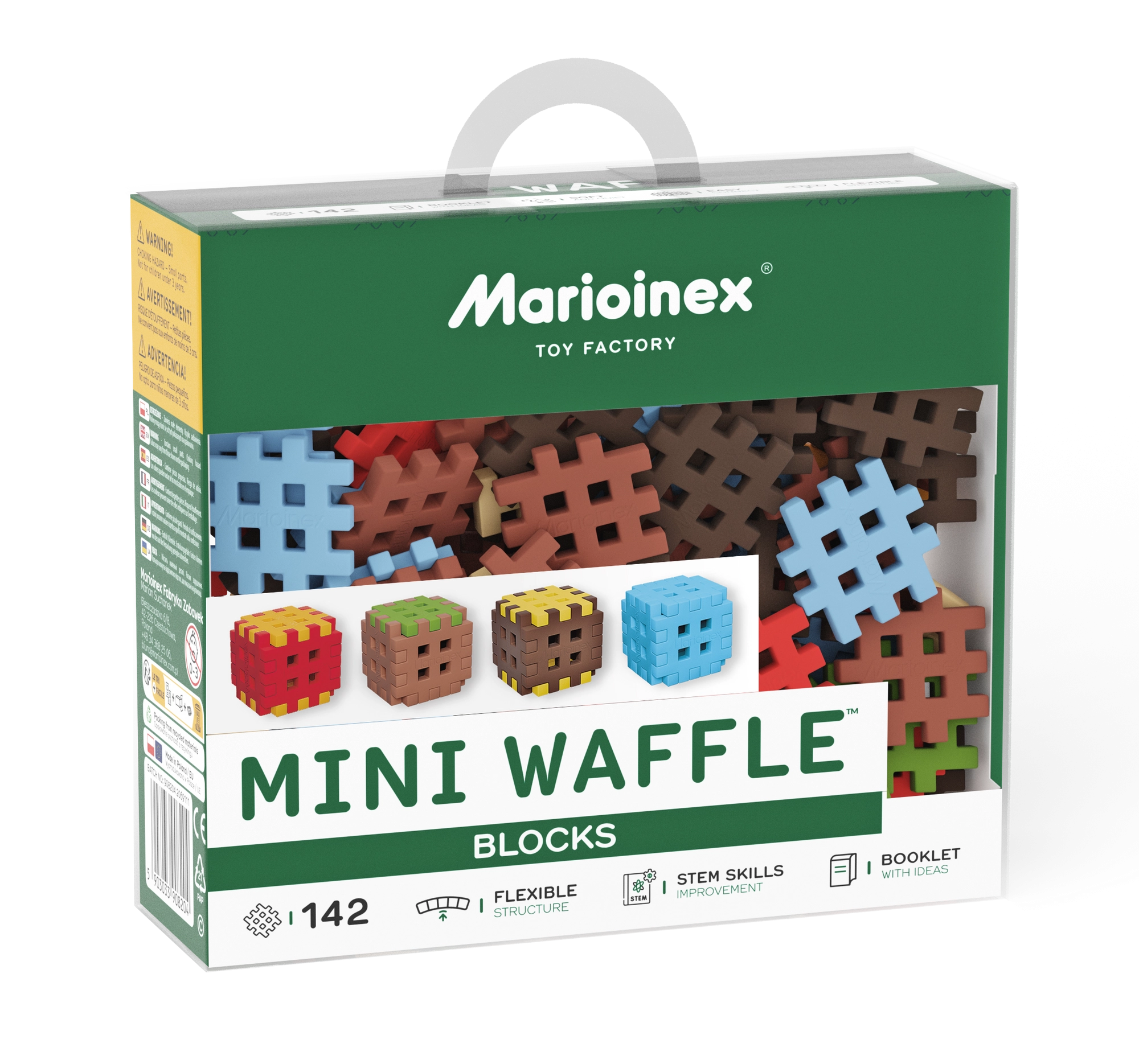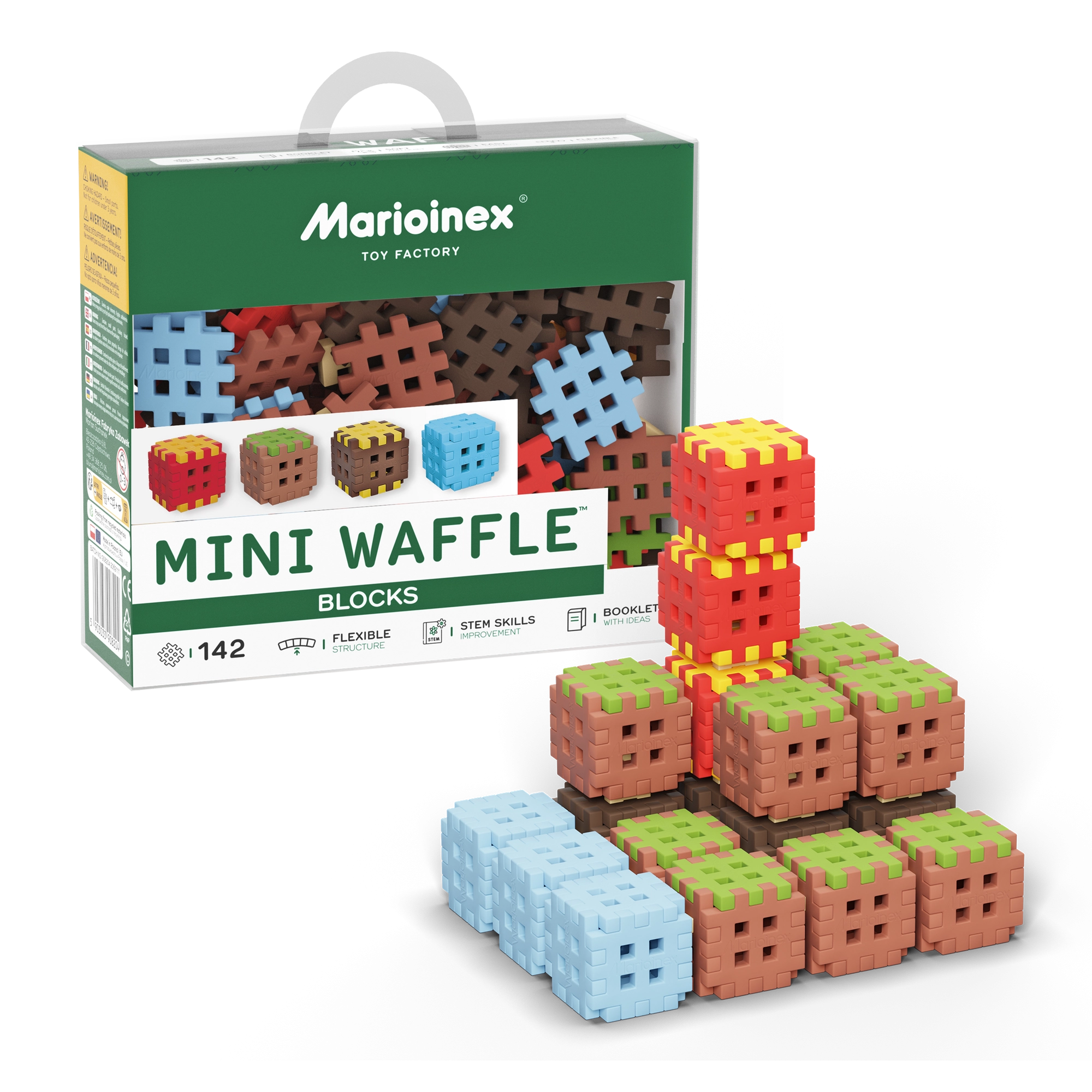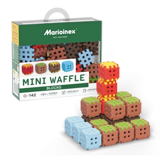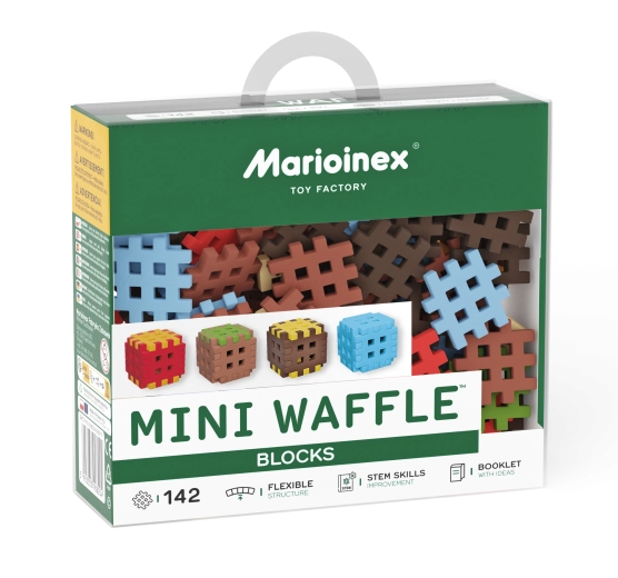Stavebnice Mini Waffle Blocks přináší 142 barevných dílků inspirovaných přírodou – hnědou „zemí“, zelenou „trávou“, ledově modrými prvky a energickými červeno‑žlutými akcenty. Díky měkkému a pružnému materiálu jsou kostky příjemné do ruky a snadno se spojují i menším dětem.