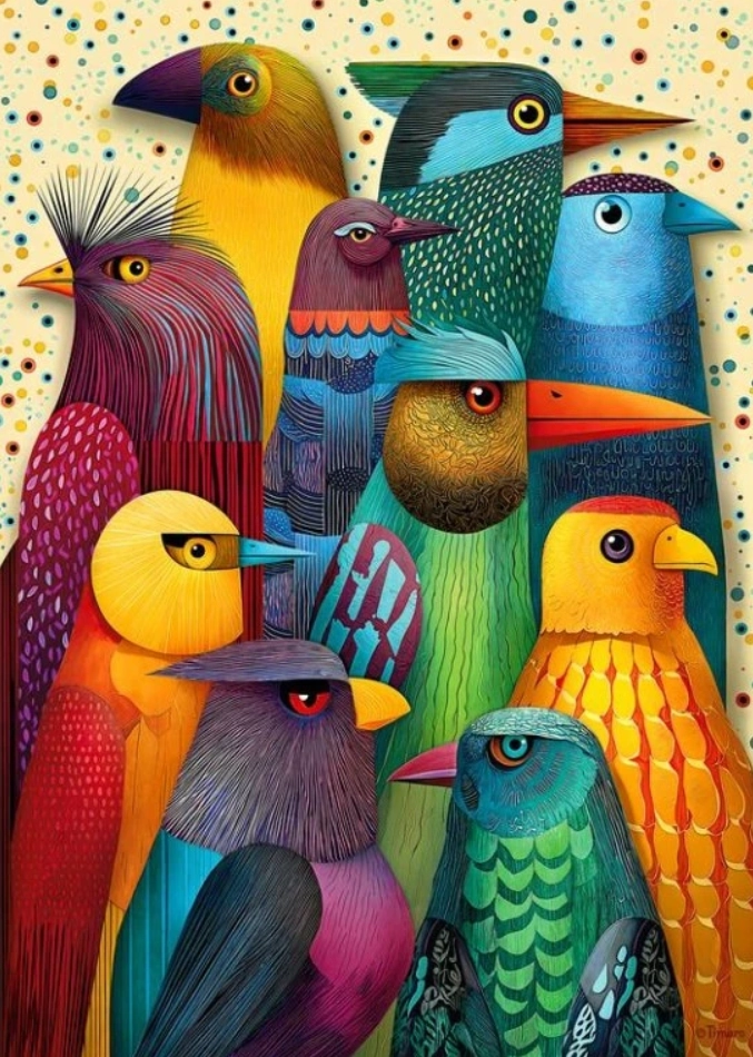 Vychutnejte si relax u skládání puzzle s motivem Ptačí klub, které spojuje jemné detaily, syté barvy a pečlivě navržené tvary dílků. Ideální jako dárek, pro domácí pohodu i jako dekorace po zalepení a zarámování.