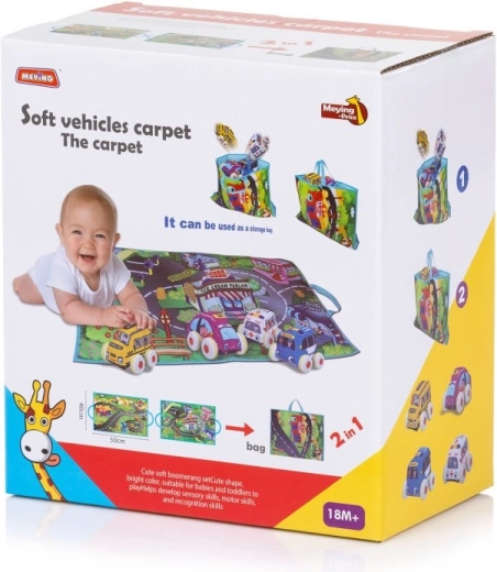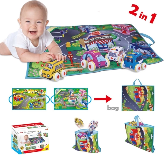 - Hrací deka se silniční mapou, 4 měkká autíčka (policie, sanitka, taxi, rodinné auto)