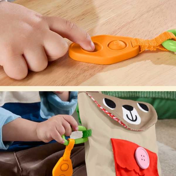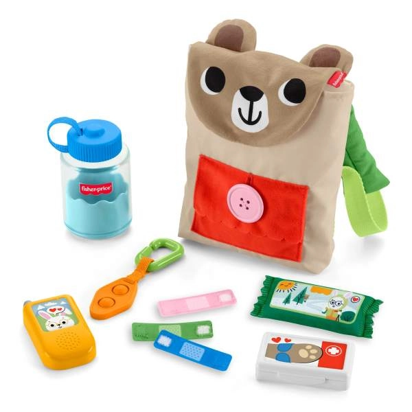 Tento hravý set od Fisher‑Price promění každou výpravu v dobrodružství. Měkký batůžek‑medvídek s kapsou na knoflík, klipem a poutky ukrývá chytré doplňky: „láhev na vodu“, dětskou „vysílačku/telefon“, látkové náplasti na suchý zip, svačinku a další prvky, které lákají k mačkání, otevírání a zapínání. Děti si procvičí koordinaci oko‑ruka, trénují úchop a zručnost, zatímco si hrají na kempování a péči.