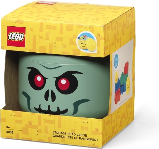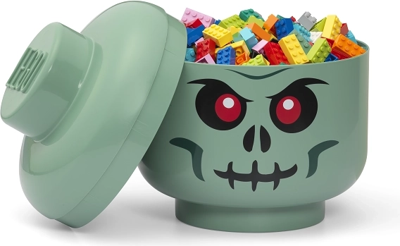 Stylový úložný box ve tvaru hlavy LEGO minifigurky s motivem zeleného kostlivce udrží pořádek v dětském pokoji. Díky objemnému prostoru a odnímatelnému víku je ideální na LEGO kostky, menší hračky nebo sladkosti. Vyrobeno z bezpečného plastu bez BPA, ftalátů a PVC.