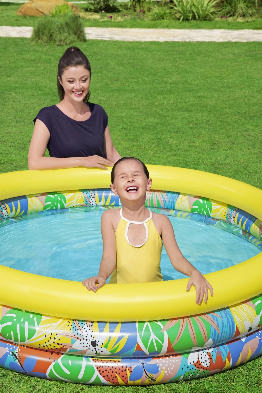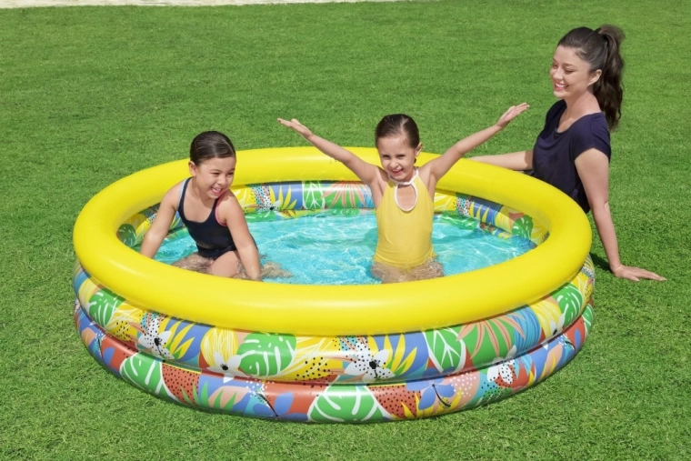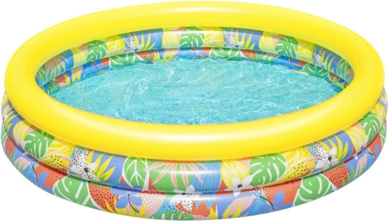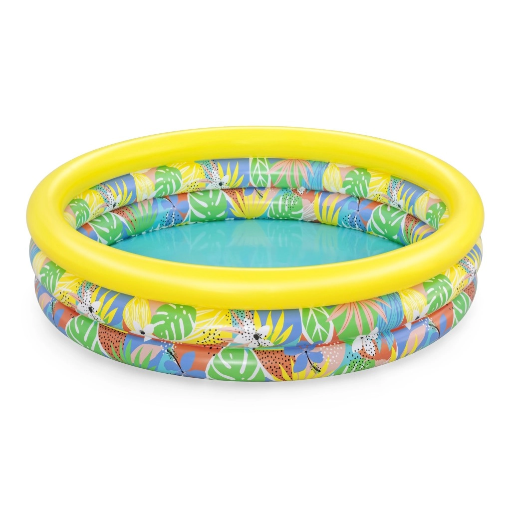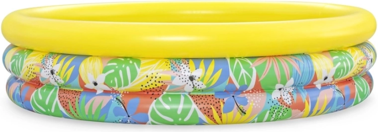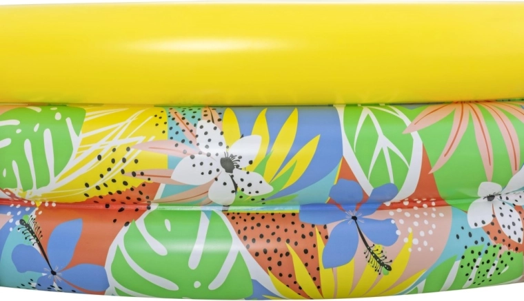 Nafukovací dětský bazén Floral Paradise přináší dětem zábavu a osvěžení v horkých dnech. Tři samostatné vzduchové komory se bezpečnostními ventily zvyšují stabilitu i pohodlí, zatímco pevné PVC odolá běžnému používání. Tropický potisk listů a květin s výrazným žlutým horním prstencem vnese do vaší zahrady atmosféru prázdnin.