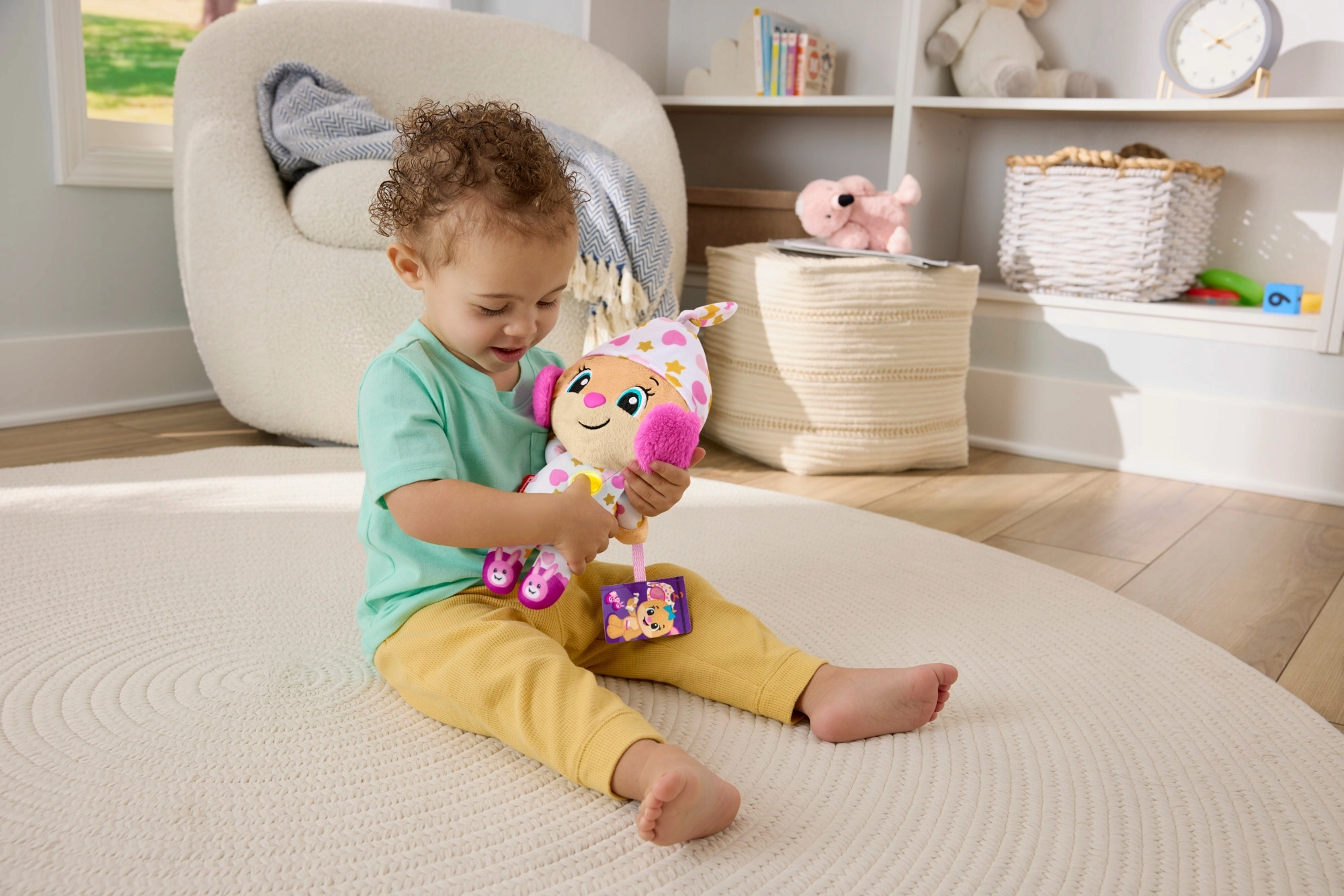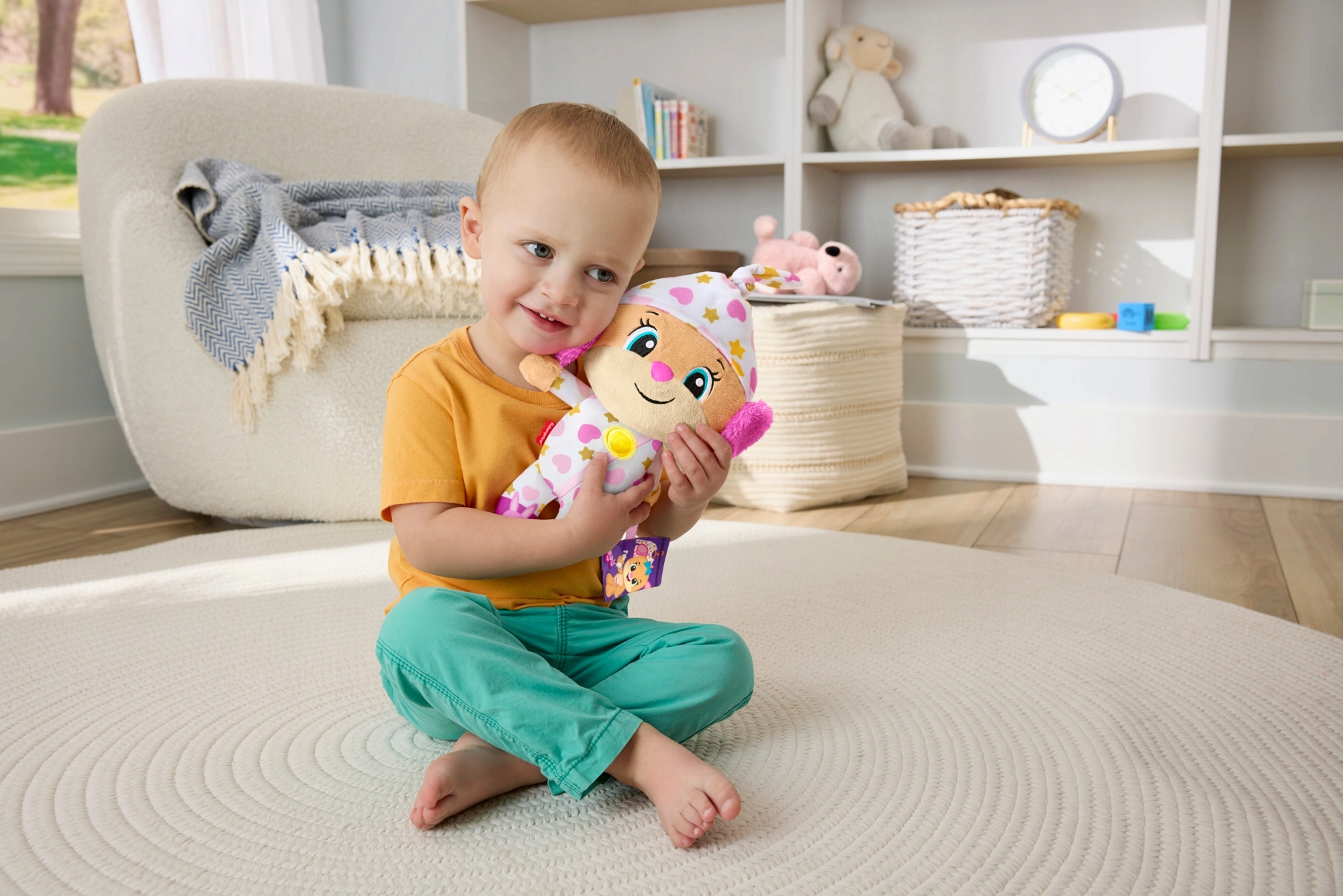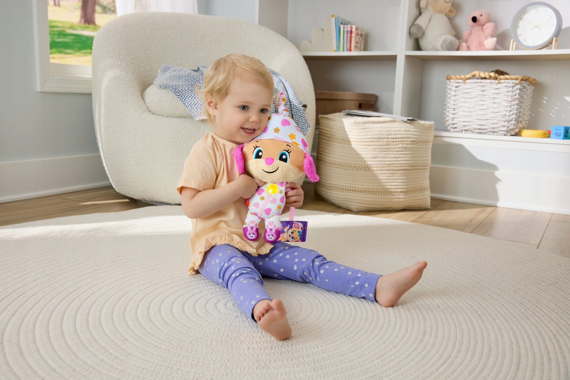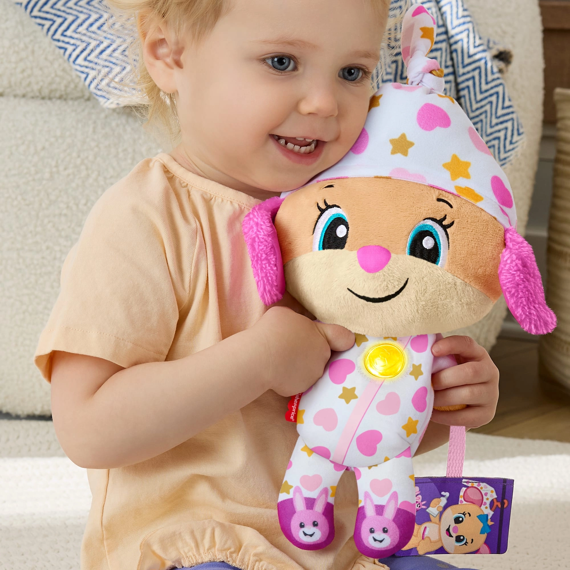 Interaktivní plyšová hračka Uč se a směj! je ideálním kamarádem pro večerní rituály i klidné chvilky během dne. V pyžamku s hravými vzory a se svítícím srdíčkem vytváří příjemnou atmosféru pro ztišení, relaxaci a usínání.