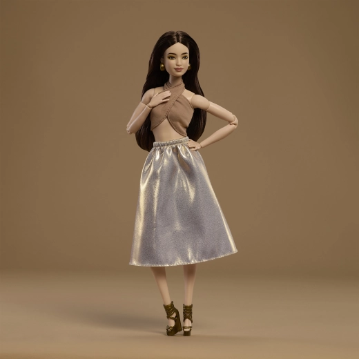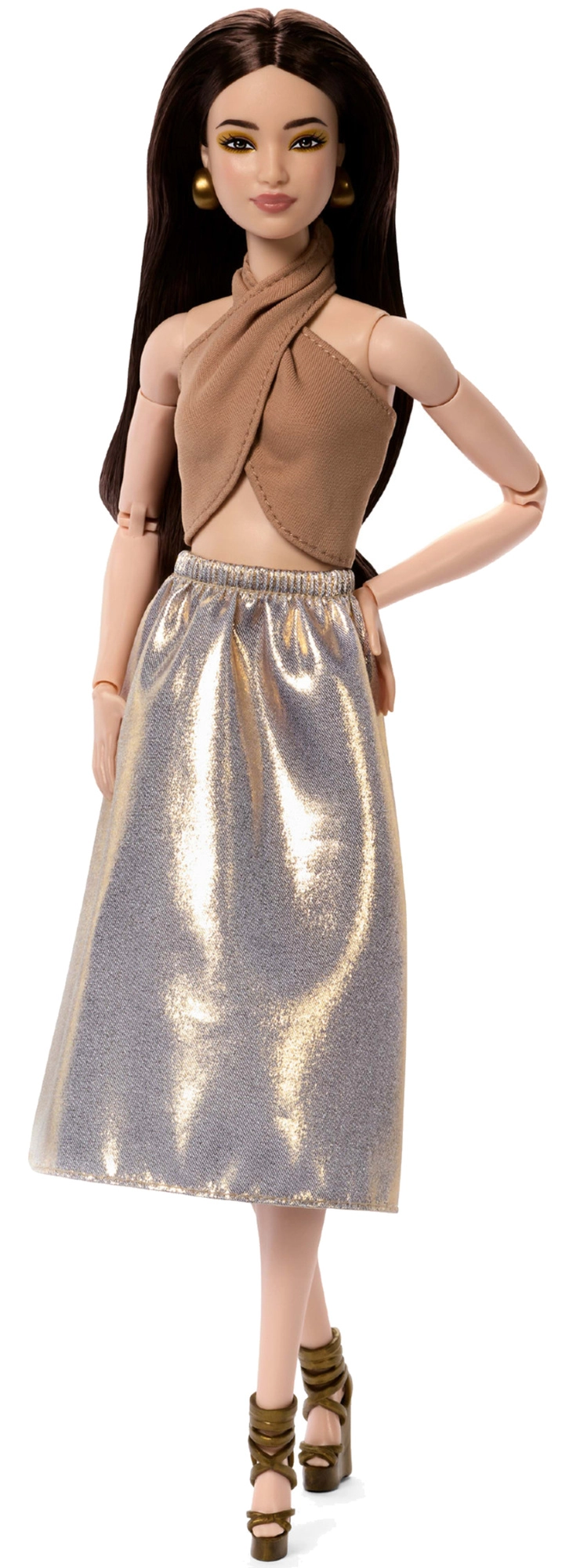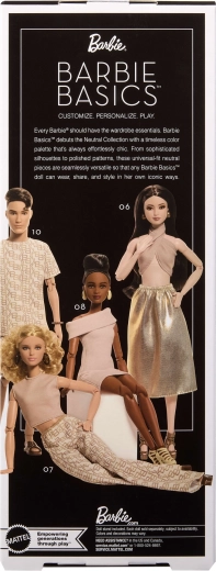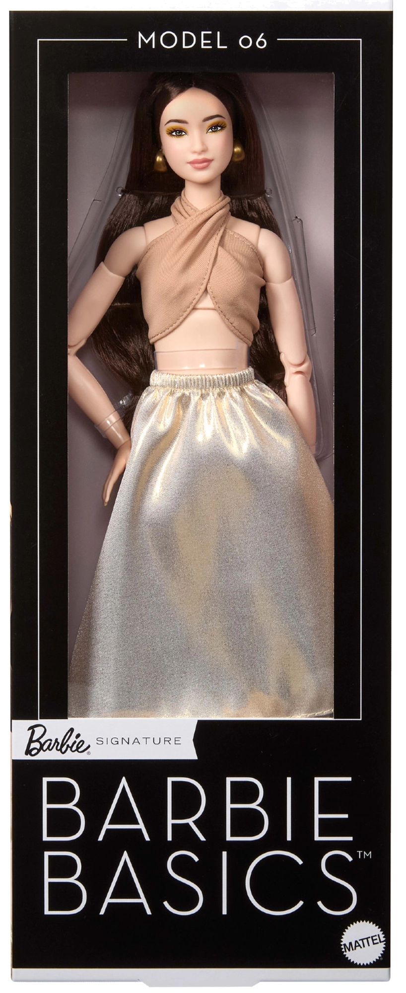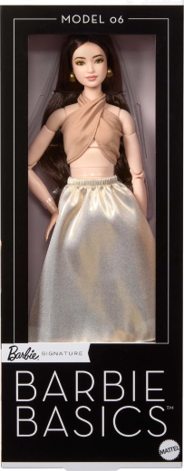 Model 06 ze série Barbie Signature Basics přináší minimalistickou eleganci v odstínech světle hnědé a zlata. Kombinace elegantního topu a volné sukně podtrhuje moderní, nadčasový vzhled. Panenka má světlou pleť, štíhlou siluetu a harmonický, decentní make-up, který zvýrazňuje její přirozenou krásu.