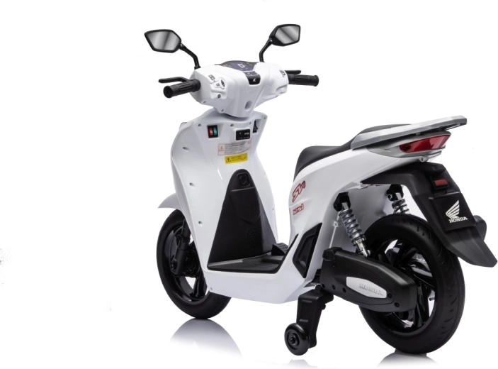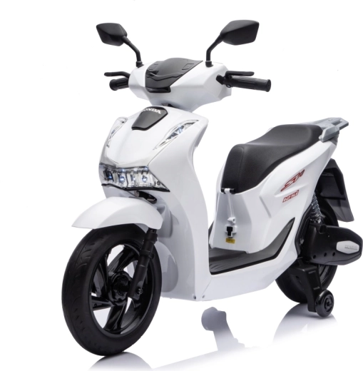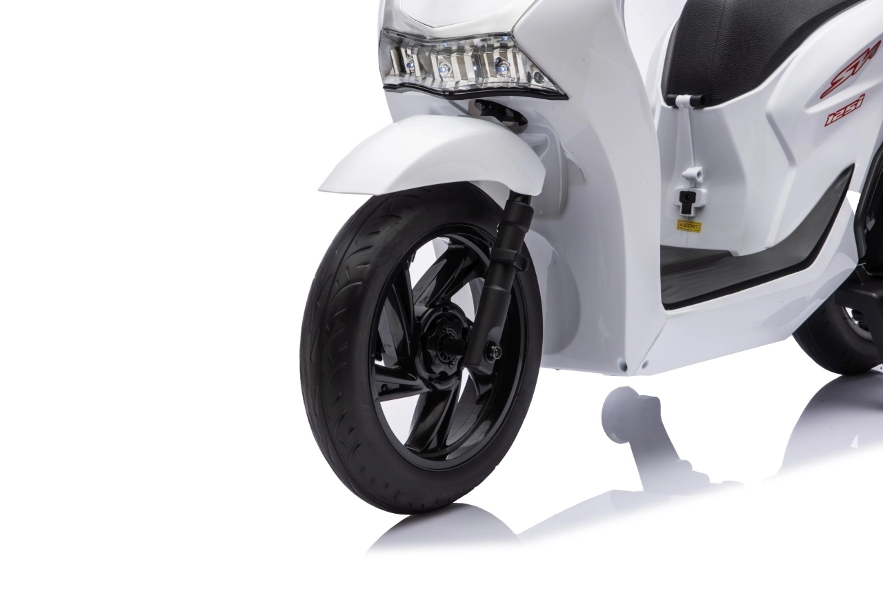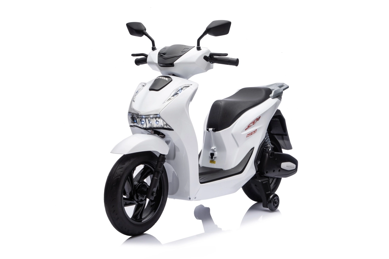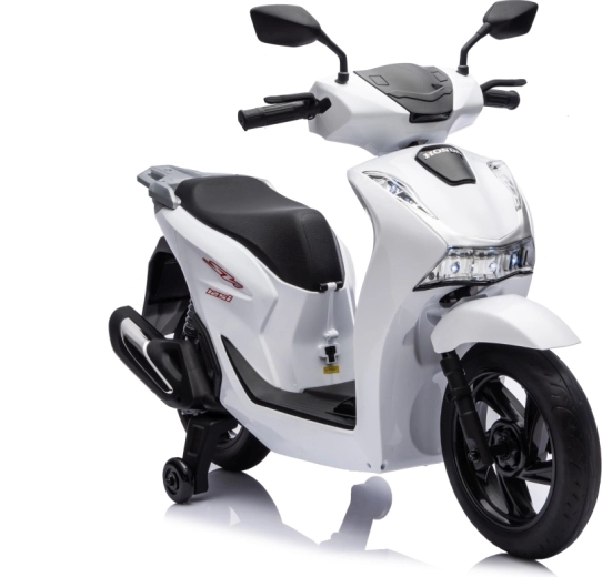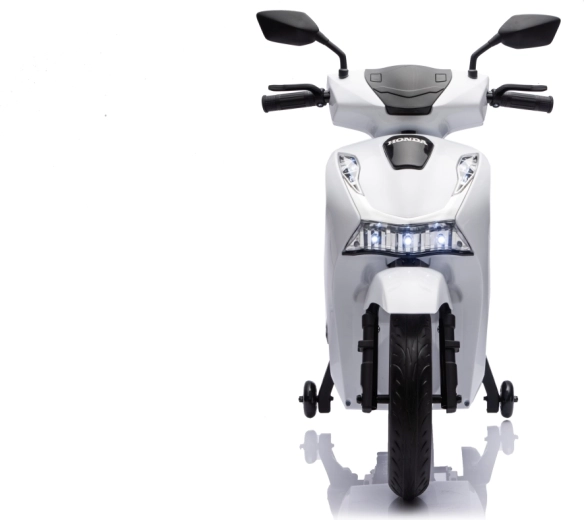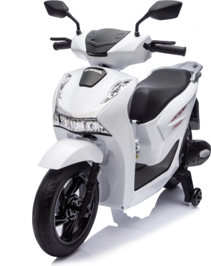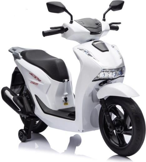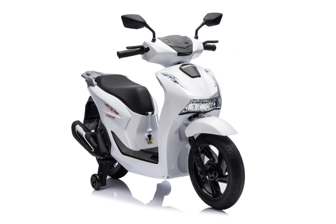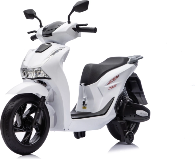 Stylový dětský elektrický skútr HONDA SH125i v bílé barvě přináší realistický zážitek z jízdy pro malé jezdce. Nabízí silný 35W motor, baterii 12V 7Ah, dvě rychlosti a jízdu vpřed/vzad. O bezpečí a pohodlí se starají boční stabilizační kolečka, EVA kola a zadní tlumiče s regulací. Vestavěný audio panel s Bluetooth, MP3, AUX a přední LED světla doplňují realistický vzhled a zábavu.