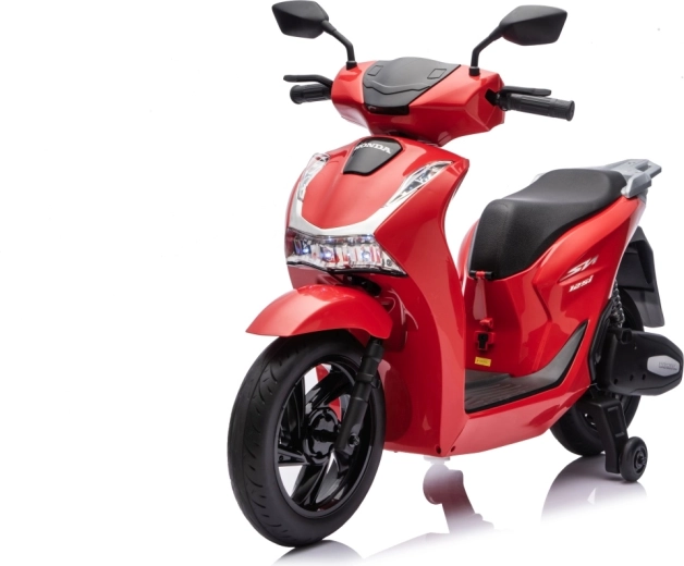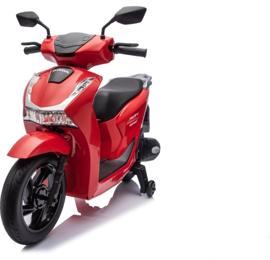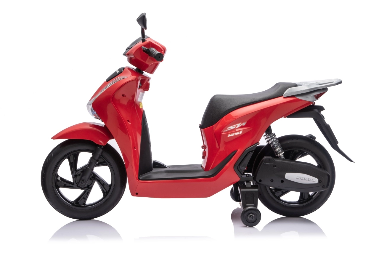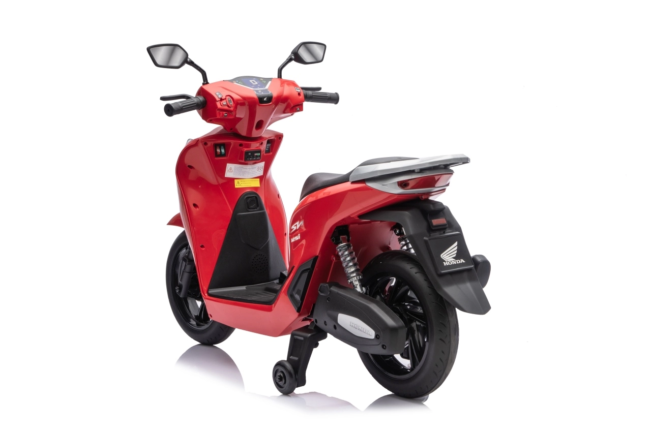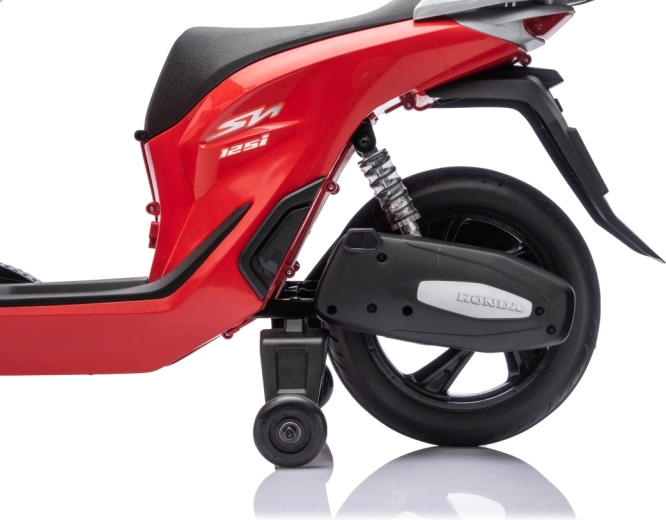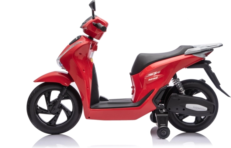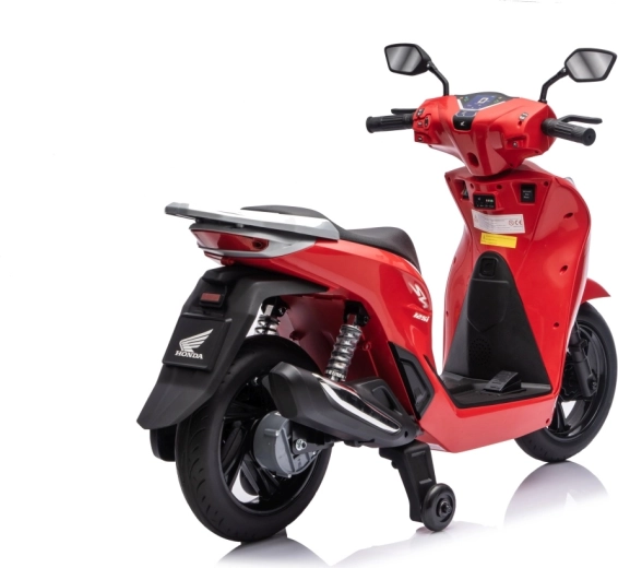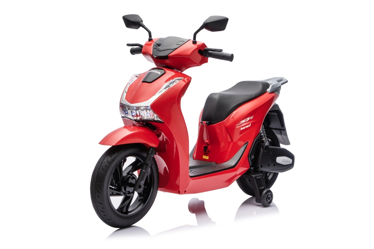 Stylový dětský elektrický skútr HONDA SH125i v červené barvě nabízí bezpečnou jízdu díky bočním stabilizačním kolečkům, pohodlné sedlo z ekokůže a tichá EVA kola. Výbava zahrnuje LED světlomety, plynulý soft start, jízdu vpřed/vzad se 2 rychlostmi a multimediální panel s Bluetooth, MP3, AUX a vestavěnými melodiemi. Napájí jej baterie 12 V / 7 Ah a motor 35 W.