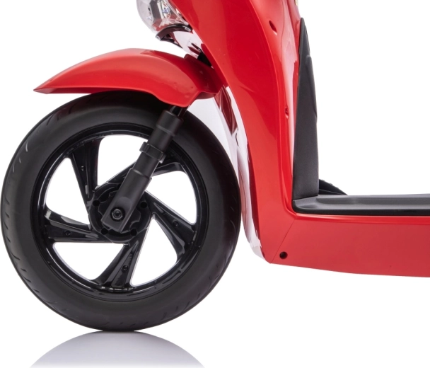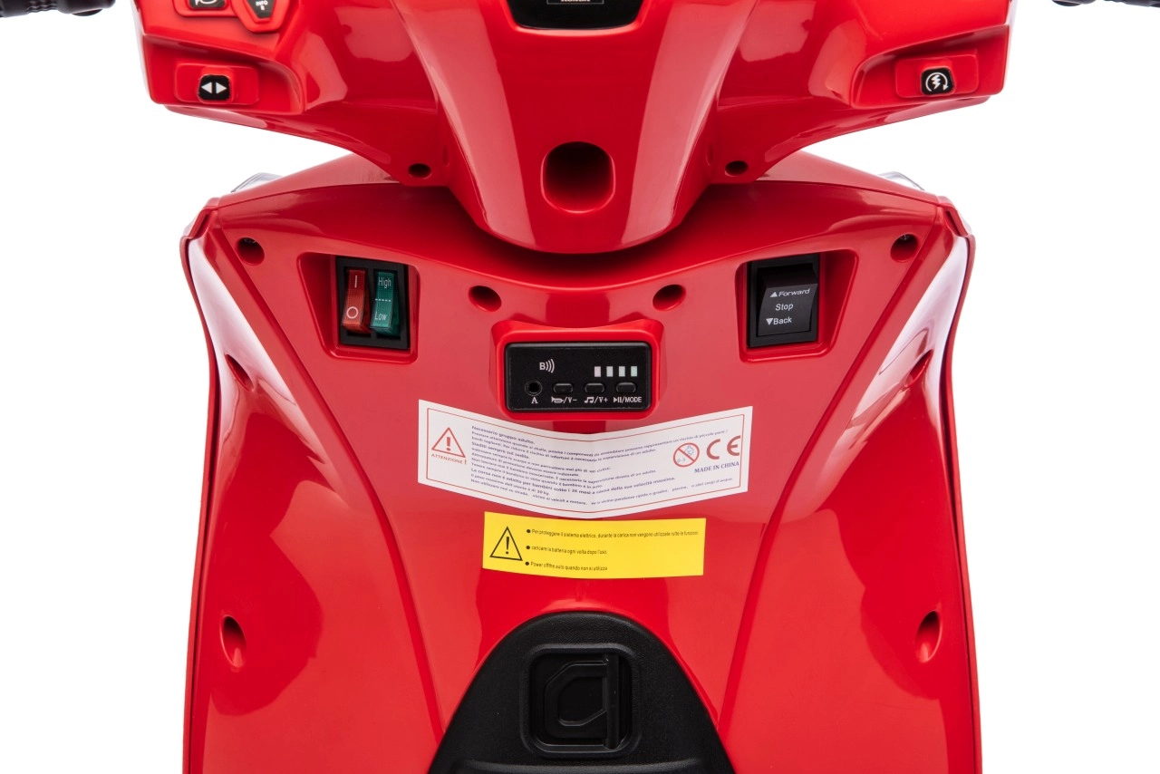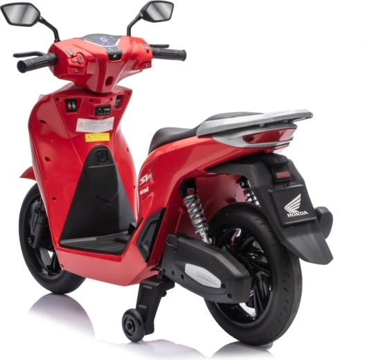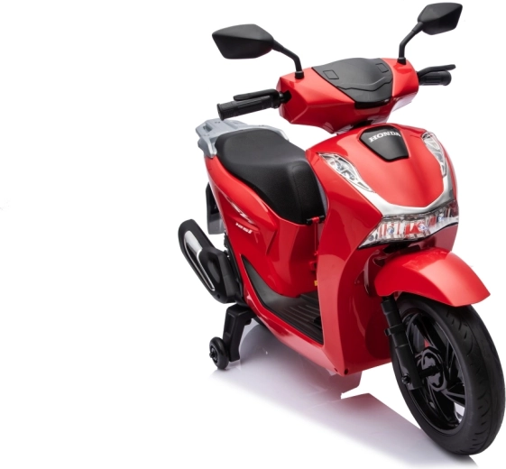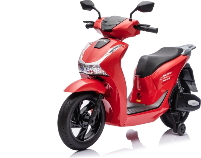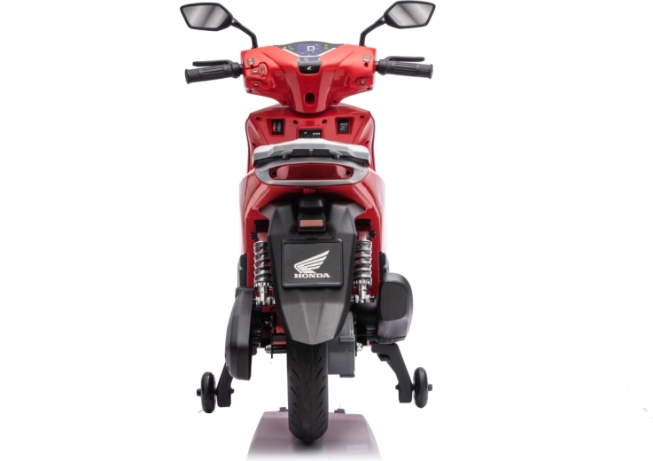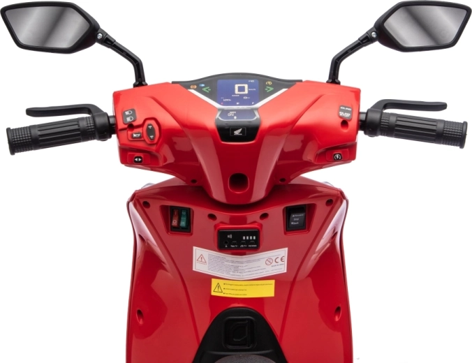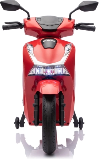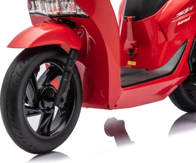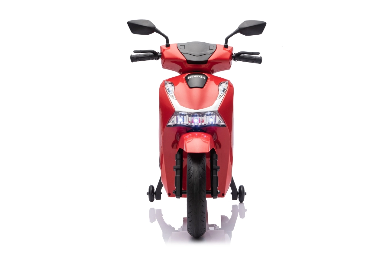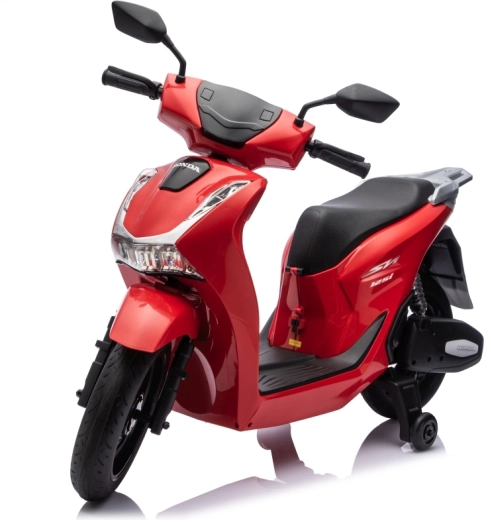 Stylový dětský elektrický skútr HONDA SH125i v červené barvě nabízí bezpečnou jízdu díky bočním stabilizačním kolečkům, pohodlné sedlo z ekokůže a tichá EVA kola. Výbava zahrnuje LED světlomety, plynulý soft start, jízdu vpřed/vzad se 2 rychlostmi a multimediální panel s Bluetooth, MP3, AUX a vestavěnými melodiemi. Napájí jej baterie 12 V / 7 Ah a motor 35 W.