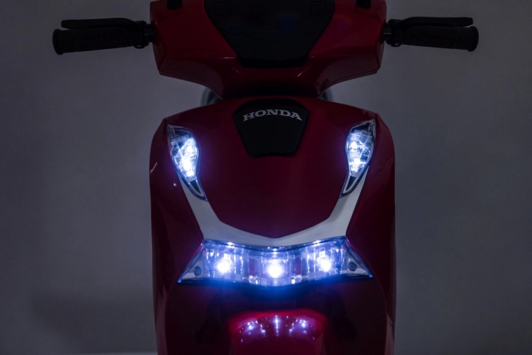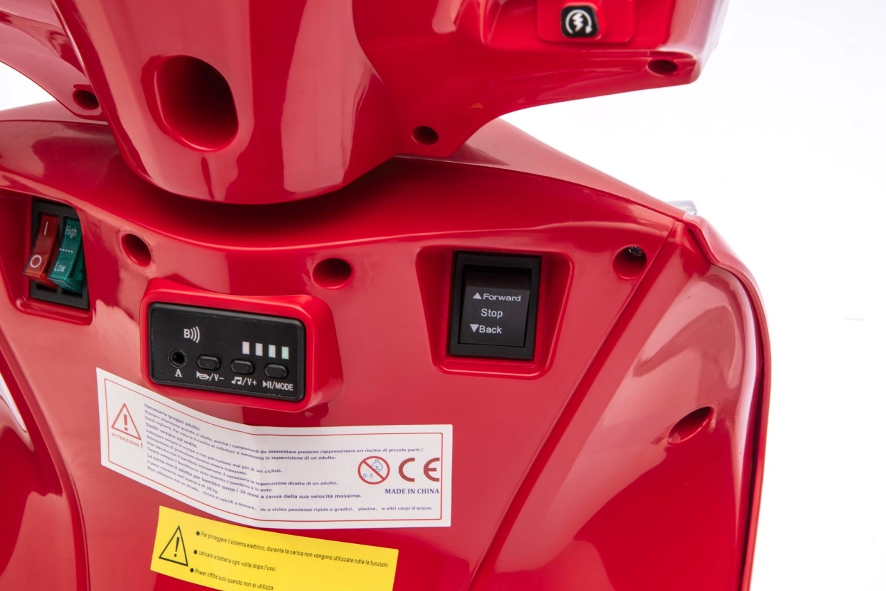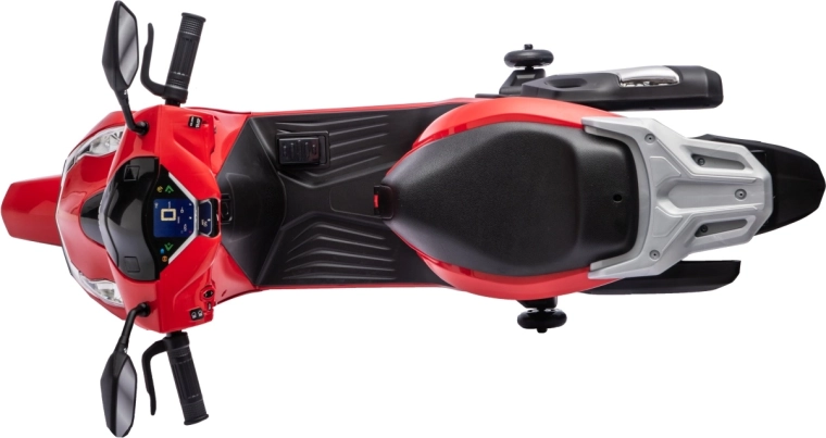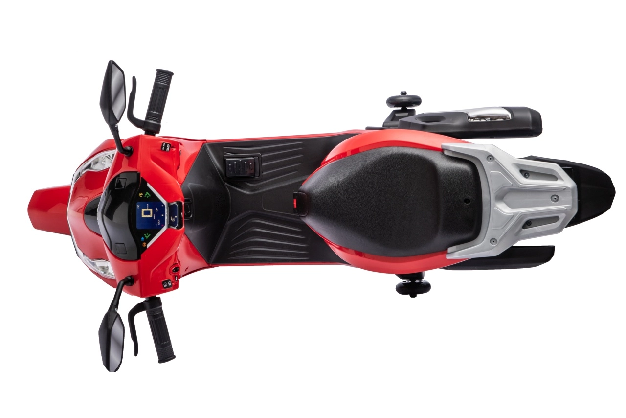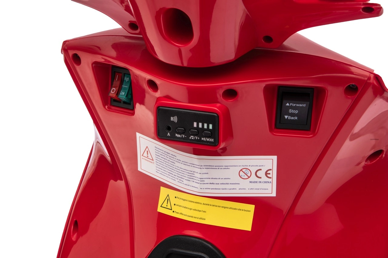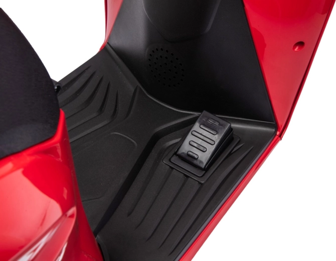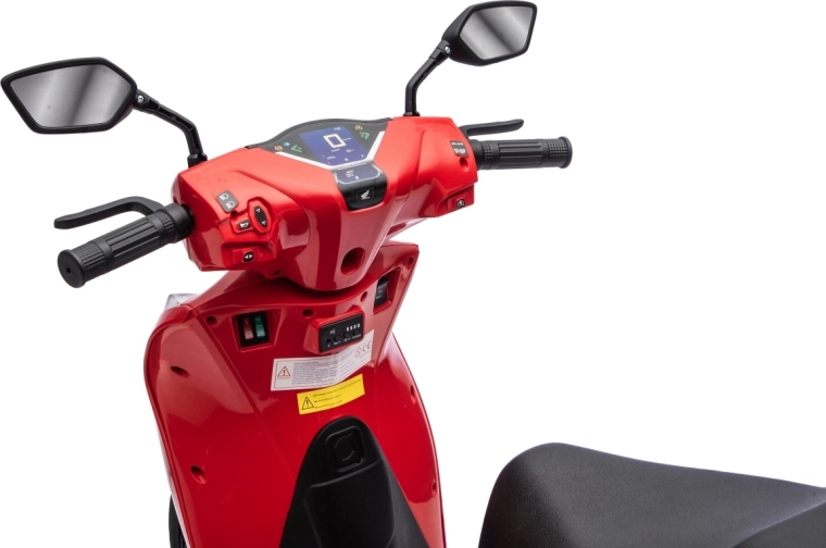 Stylový dětský elektrický skútr HONDA SH125i v červené barvě nabízí bezpečnou jízdu díky bočním stabilizačním kolečkům, pohodlné sedlo z ekokůže a tichá EVA kola. Výbava zahrnuje LED světlomety, plynulý soft start, jízdu vpřed/vzad se 2 rychlostmi a multimediální panel s Bluetooth, MP3, AUX a vestavěnými melodiemi. Napájí jej baterie 12 V / 7 Ah a motor 35 W.