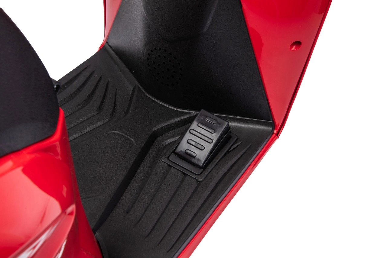 Malí řidiči si užijí LED přední světla s vlastním spínačem a zábavní panel s Bluetooth, MP3, AUX a přednahranými melodiemi. Skútr nabízí jízdu vpřed i vzad se dvěma rychlostmi, startování probíhá jednoduše tlačítkem. Pohodlné sedlo z ekokůže a protiskluzový nášlap zvyšují bezpečí i komfort.