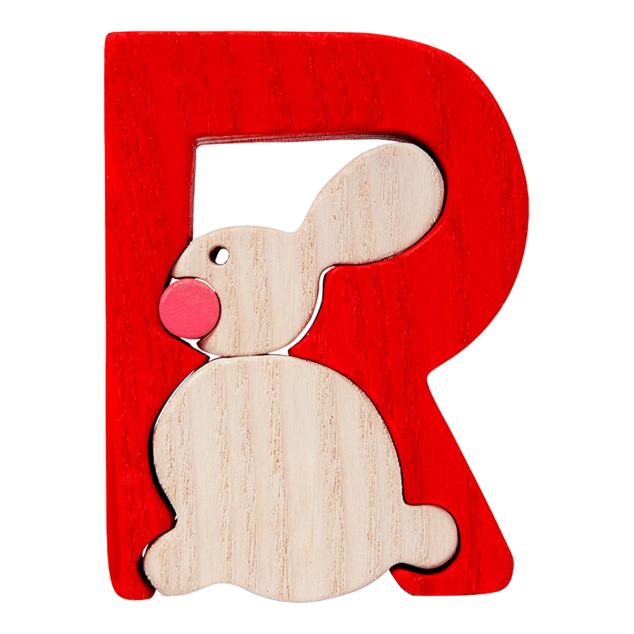 Dřevěné písmeno R se zajíčkem pomáhá dětem zábavnou formou zvládnout základy abecedy. Lze ho využít jako součást skládačky, k sestavení jména nebo jako dekoraci na stěnu či nábytek (při použití oboustranné lepicí pásky). Masivní provedení zajišťuje dlouhou životnost a bezpečné hraní.
