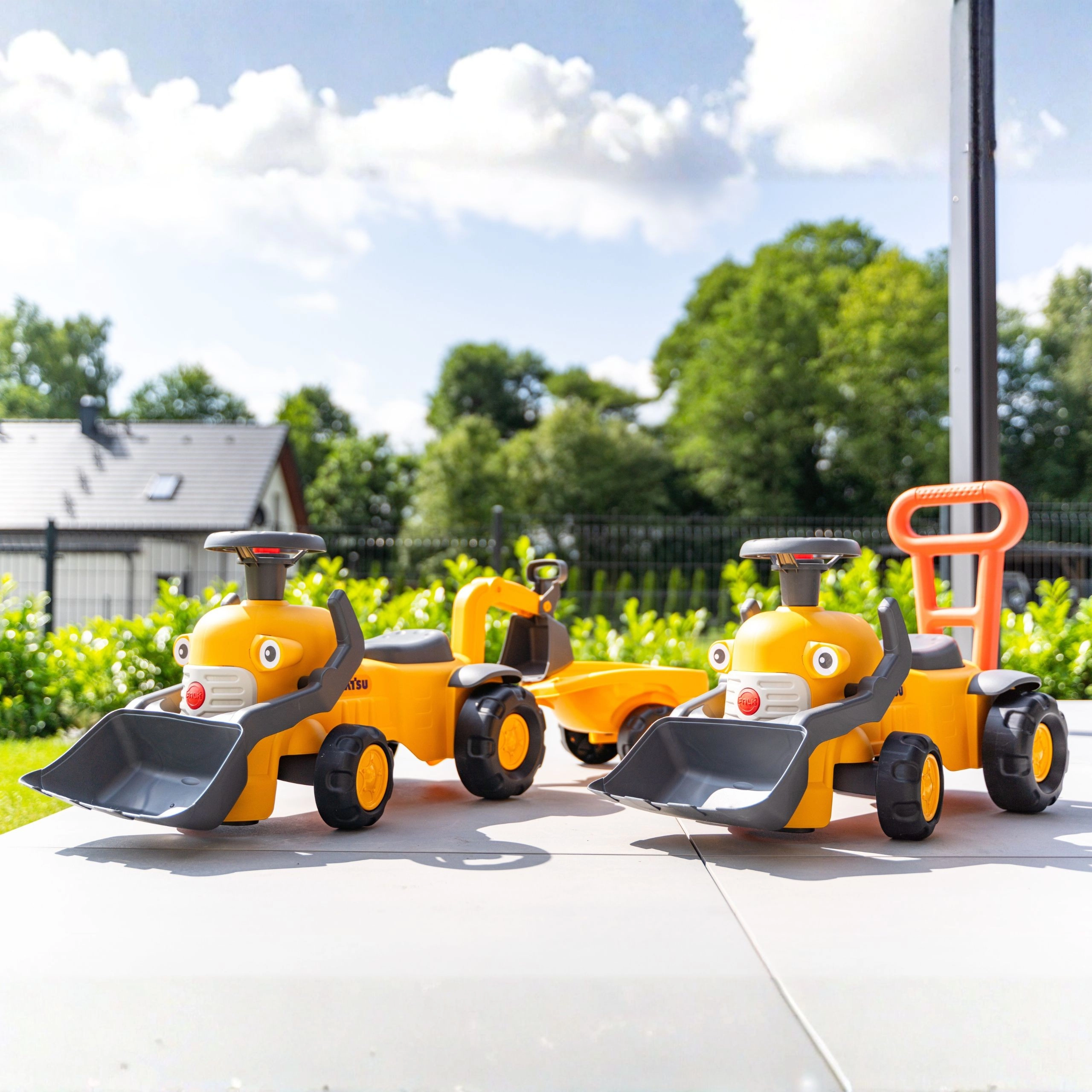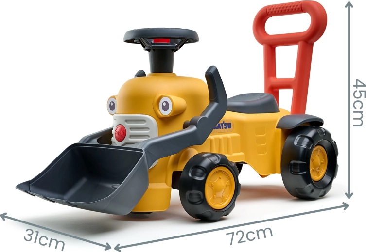 Toto dětské odrážedlo v designu stavebního stroje KOMATSU kombinuje zábavu s rozvojem dovedností. Díky mechanicky ovládané přední lžíci mohou malí stavitelé nabírat písek či kostky, zatímco klakson na volantu přidává hře realistické prvky. Vysoké ergonomické opěradlo/úchyt slouží jako pchací madlo pro první krůčky a lepší stabilitu.