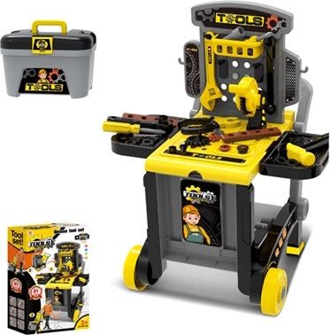 Tato dětská dílna přináší vše, co malý opravář potřebuje: pracovní plochu, praktickou skříňku a vozík pro snadné přesouvání nářadí. Realistické provedení podporuje fantazii a učí děti základům pořádku a organizace.