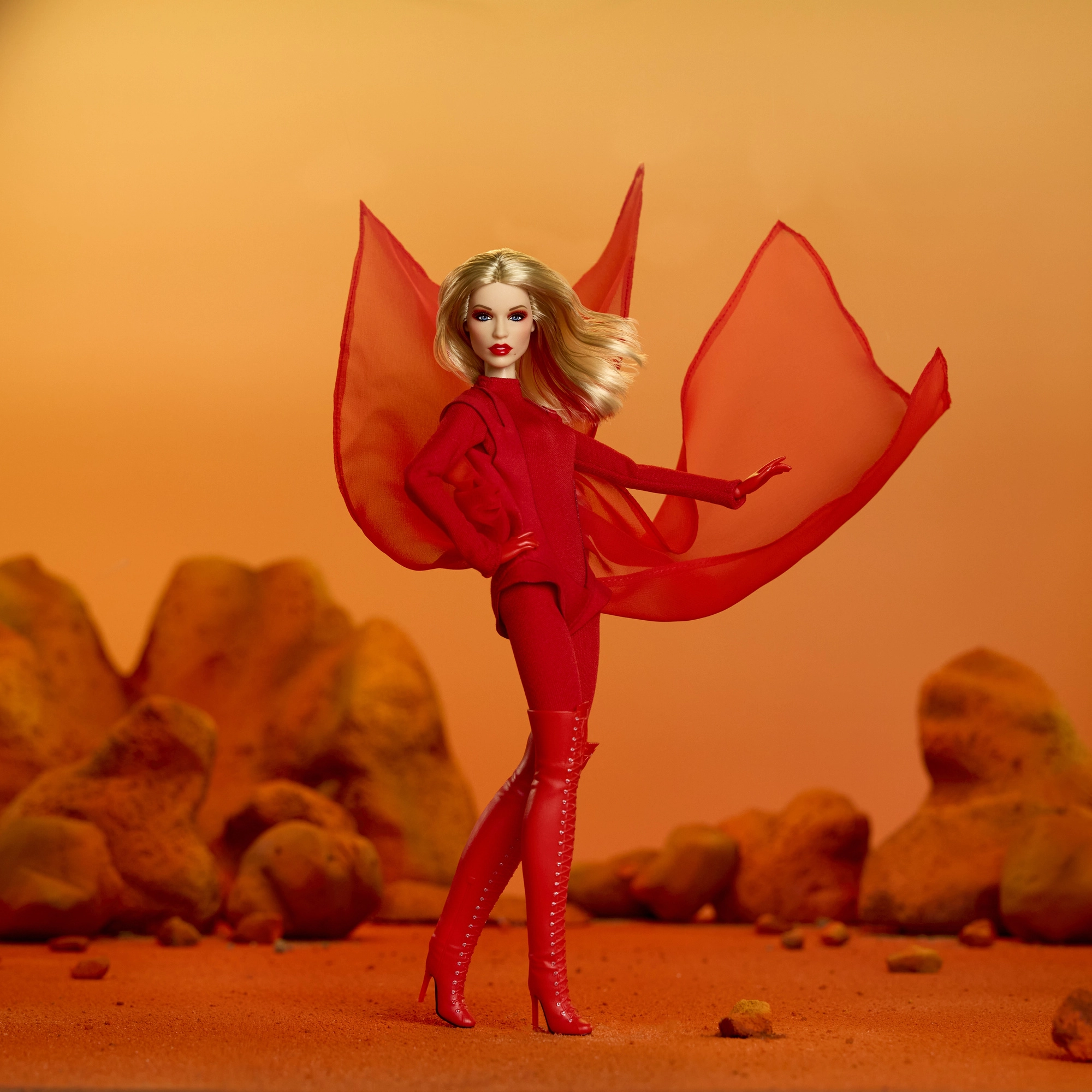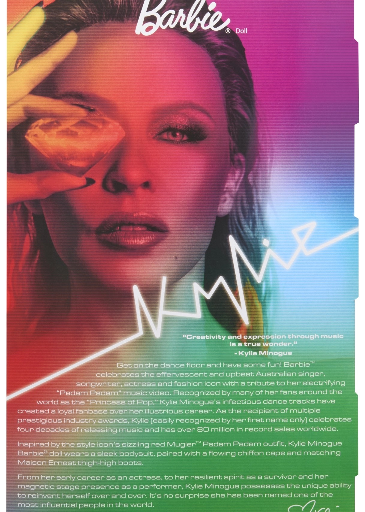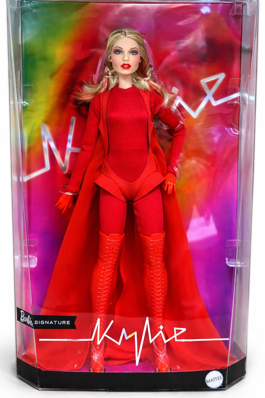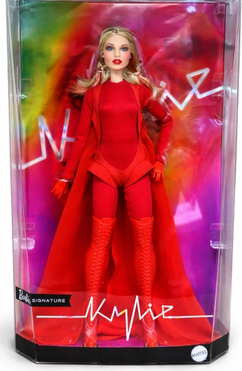 Tato sběratelská edice Barbie vzdává hold inspirativním ženám v sérii Role Models. Panenka ztvárňuje Kylie Minogue v dramatické červené stylizaci inspirované hudebním videem, s dlouhými blond vlasy a jemnými červenými proužky, modrýma očima a precizním make-upem pro autentický, pódiový vzhled.