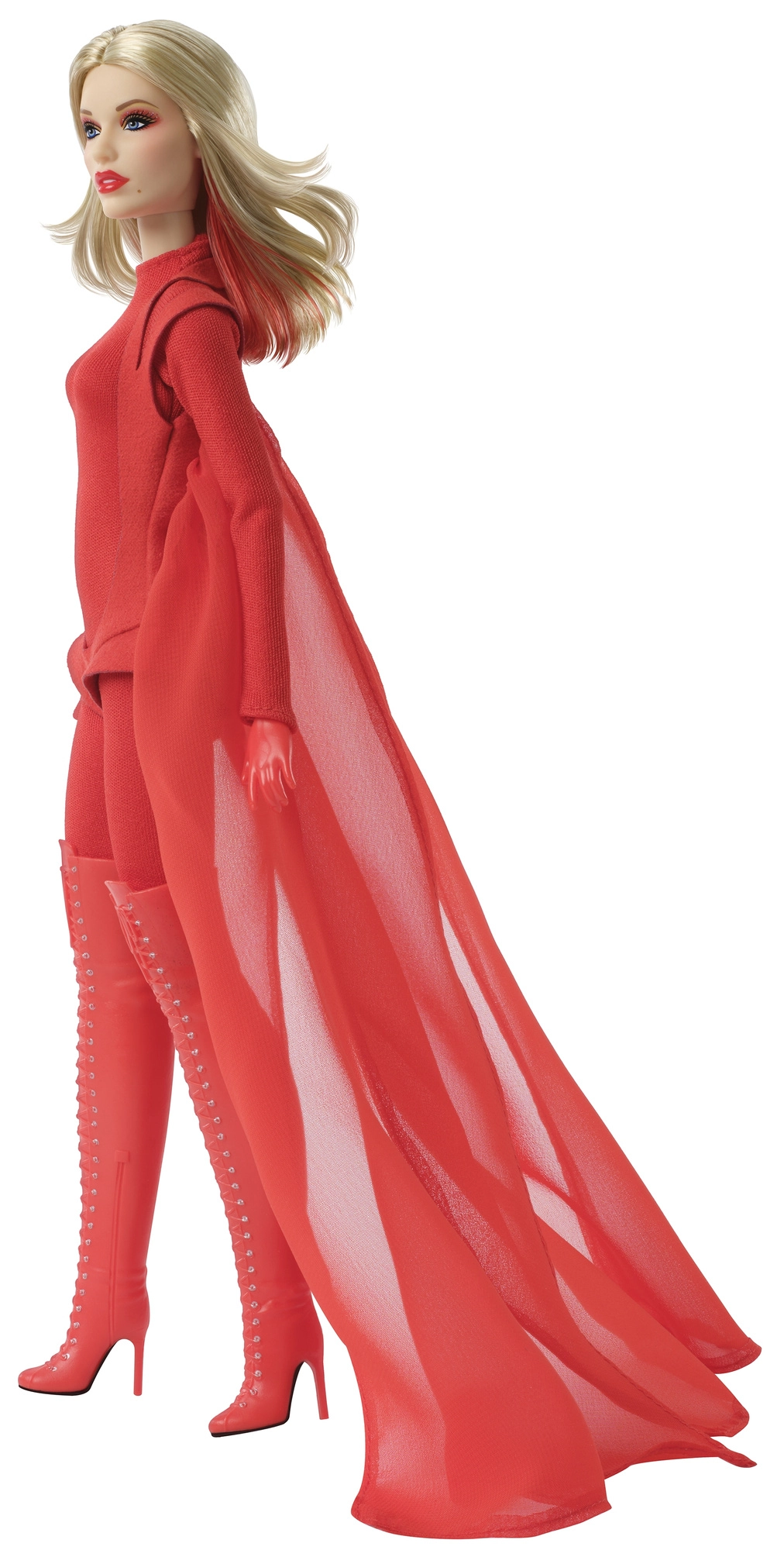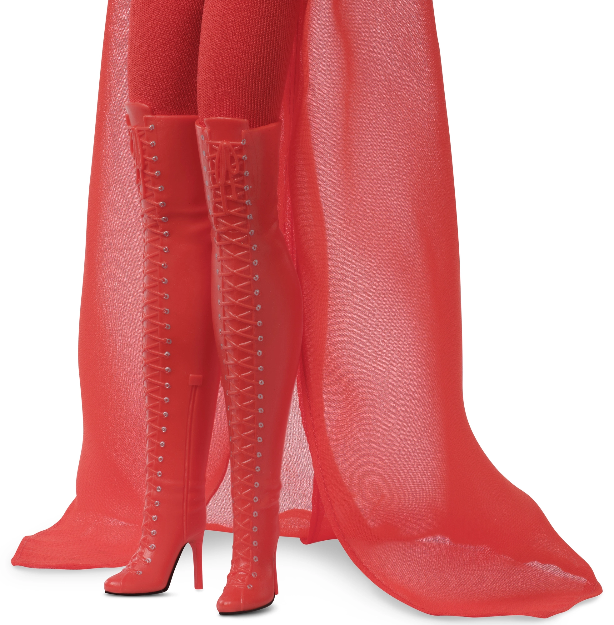 Outfit tvoří přiléhavý červený overal s průsvitným efektem a krátký vrchní díl, který přechází v dlouhou splývavou pláštěnku. Look doplňují kozačky nad kolena se šněrováním a vysokými podpatky – skutečný statement kousek pro výstavku.